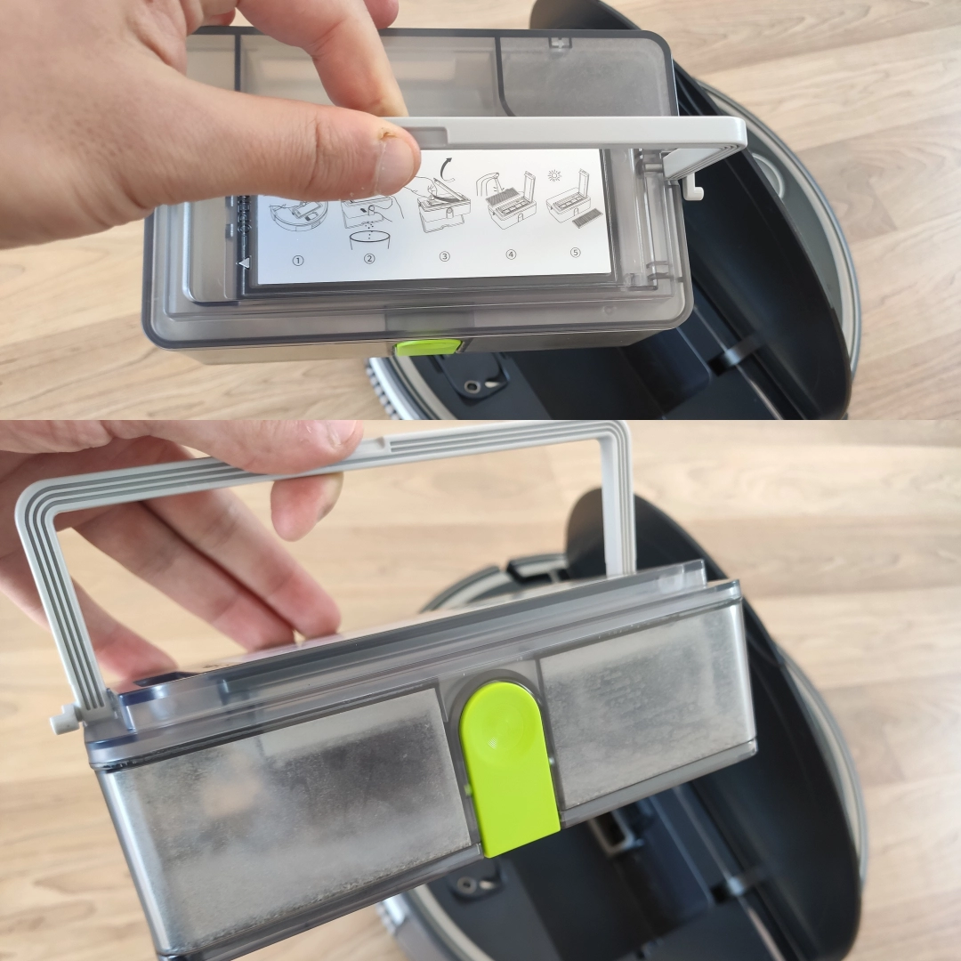 Dadurch, dass sowohl Wassertank als auch Staubkammer feste Bestandteile des Roboters sind, muss man zur Aktivierung der Wischfunktion des S10 nur den Wischaufsatz auf der Unterseite anbringen. Der Saugroboter erkennt diesen automatisch und kommentiert die Anbringung auch.