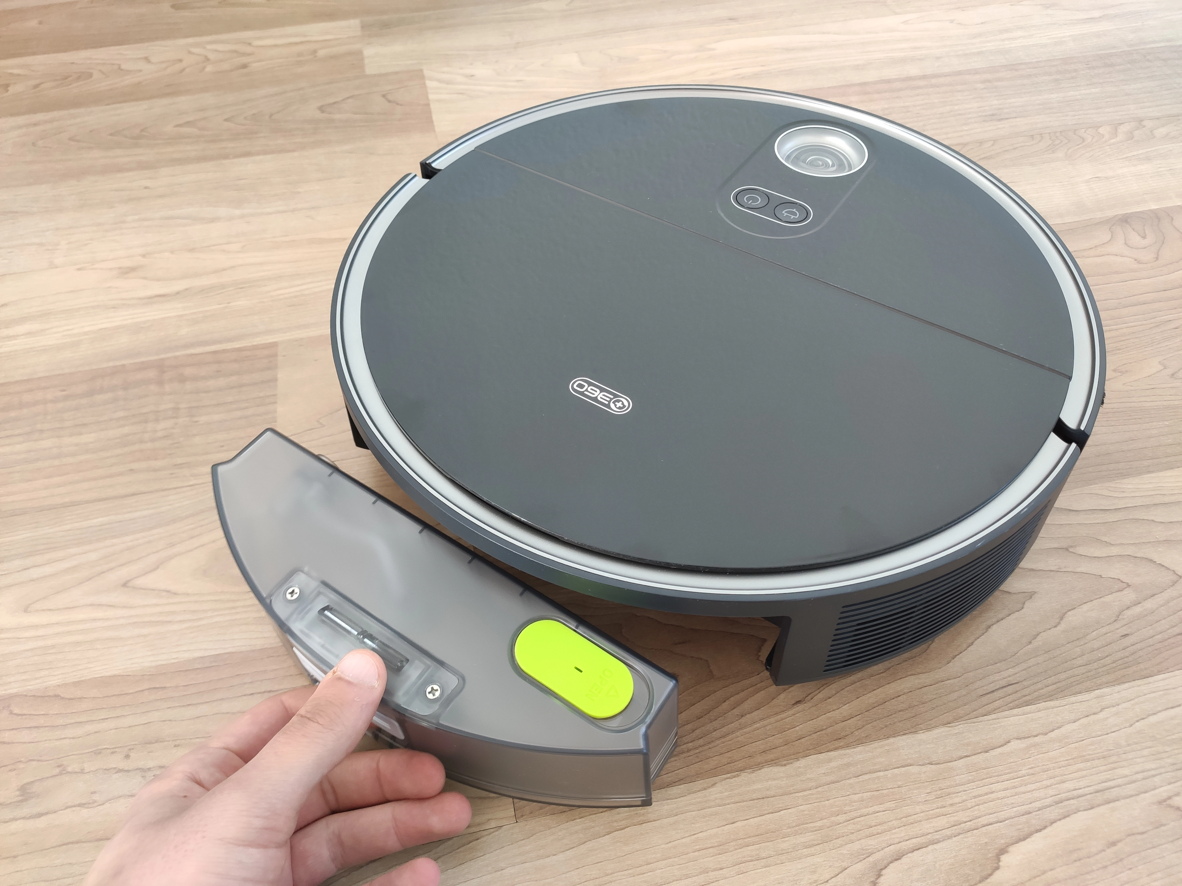 Längst keine Weltneuheit mehr ist der elektrische Vibrationswassertank, wodurch der Roboter in der Lage ist, wie beim manuellen Wischen etwas Druck auf den Boden auszuüben. Auch die Wassermenge, die vom Wassertank auf das Mikrofasertuch tropft, ist in der App einstellbar (drei Stufen). Zur Aktivierung der Wischfunktion muss man den Wischaufsatz samt angebrachtem Mikrofasertuch auf der Unterseite anbringen und den 0,52 l großen Wassertank mit – erraten – Wasser befüllen.