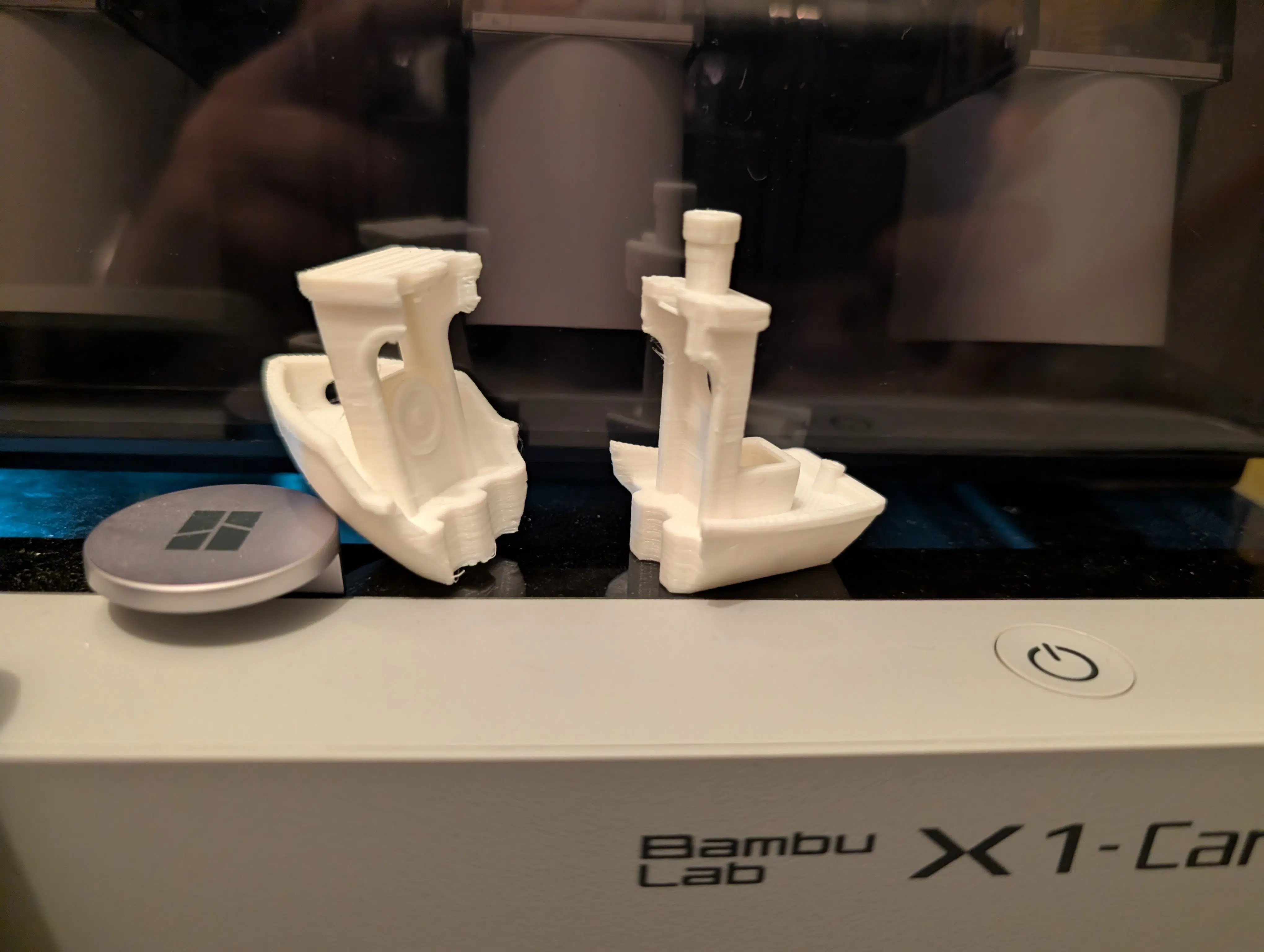 Aber passt das Ganze nachher auch zusammen? Wir haben zum Gegencheck ein klassisches Benchy in der Z-Achse geteilt (5mm Zick-Zack) und auf dem Bambu Lab X1C gedruckt. Dabei haben wir im Slicer penibel darauf geachtet, dass keine Z-Nähte in den Teilungsflächen liegen, um das Ergebnis nicht zu verfälschen. Das Resultat nach 49 Minuten Druckzeit ist „okay“, aber nicht perfekt. Man sieht einen deutlichen Spalt (Gap) zwischen den Teilen. Das Tool scheint keine Toleranz von 0,1 bis 0,2 mm wegzurechnen, um die Passung „saugend“ zu machen.