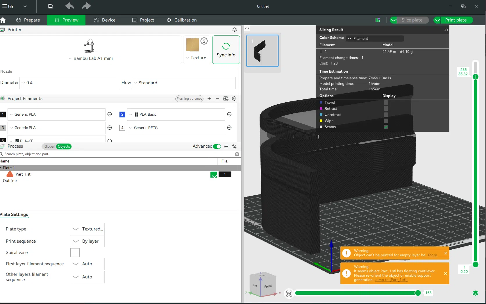 Und hier kommt das erste Problem: Nach dem Klick auf „Slice Model“ (was fast augenblicklich geschieht), sahen die Teile gut aus. Im Bambu Studio fehlten dann aber plötzlich Wände und Schichten. Offenbar war unsere definierte Bohrung größer als die Wandstärke des Modells. Eine Warnung vom Tool? Fehlanzeige. Im zweiten Versuch ohne Loch hat dann alles reibungslos geklappt.