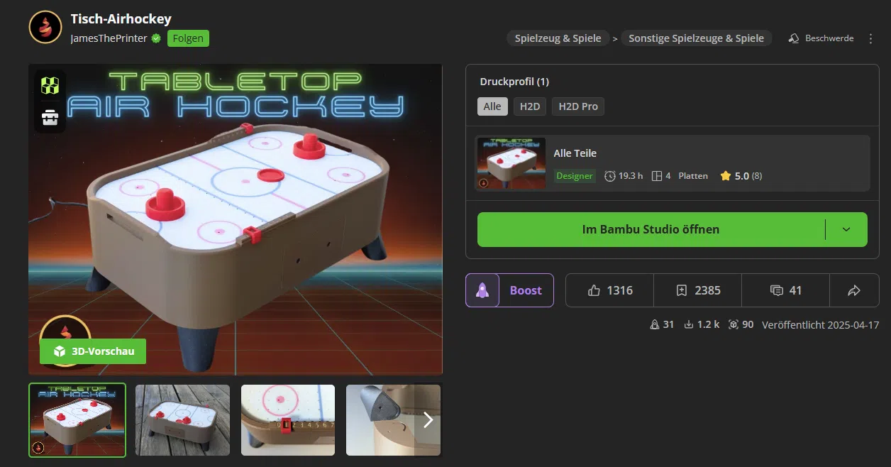 Wir haben uns den Air-Hockey-Tisch geschnappt, den wir eigentlich im Rahmen des Tests des riesigen Elegoo OrangeStorm Giga gedruckt hatten. Die Datei ist bei Makerworld für Bambu Labs H2-Serie ausgelegt, wir wollten einen Teil davon aber auf den kleinen Bambu Lab A1 Mini (180er Bauraum) bringen. Also: Zick-Zack-Muster rein und zusätzlich ein Loch für einen Passstift definiert.