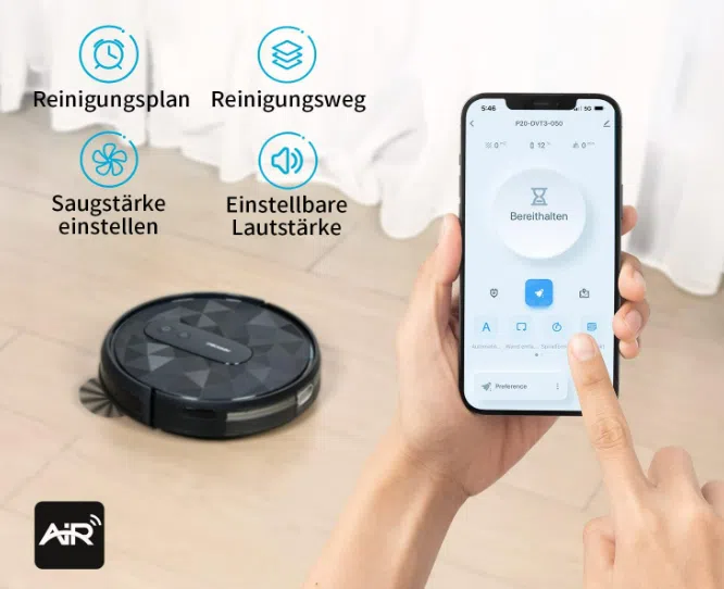 Zum Einbinden in euer Wi-Fi Netzwerk nutzt ihr die AIRROBO App (Android | iOS). Dort könnt ihr den Saugroboter starten oder einen Zeitplan festlegen. Alternativ gibt es aber auch eine physische Fernbedienung, wo ihr den Saugroboter starten oder den Reinigungsmodi festlegen könnt.