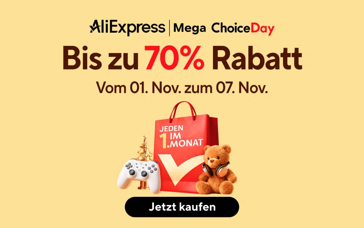 Der November startet direkt mit einem Paukenschlag: Der AliExpress Choice Day ist zurück und bringt ab Samstag, den 01.11.2025, eine ganze Ladung an starken Angeboten mit. Diesmal sind wieder einige Kracher dabei, von der brandneuen DJI Mini 5 Pro über die Nintendo Switch bis hin zu den Sony XM6 Kopfhörern. Mit unseren exklusiven Gutscheinen könnt ihr dabei noch mehr sparen!