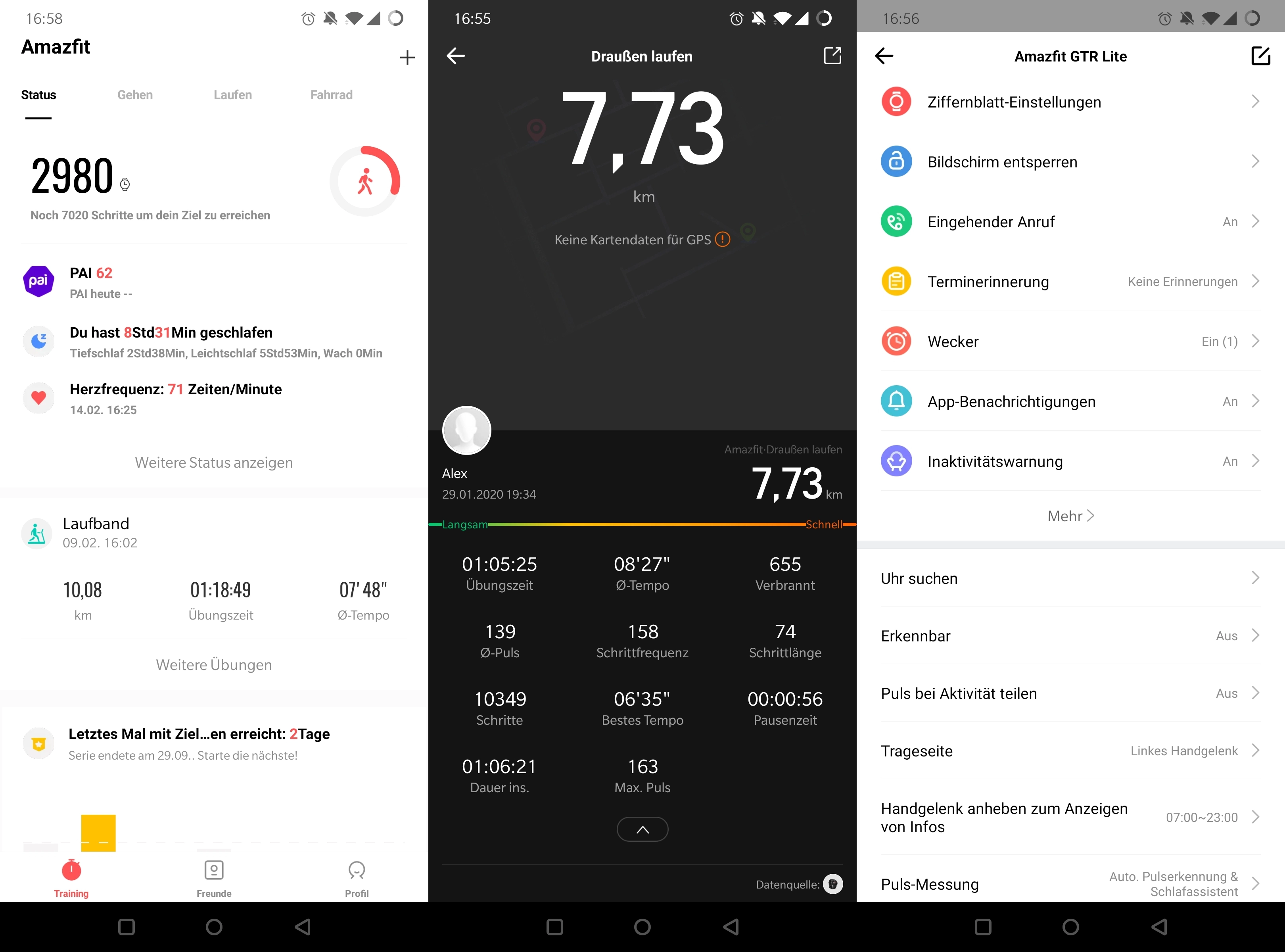 Hinzu kommt, dass man die Amazfit GTR Lite die größte Schwäche der GTR einfach ausmerzt: Die GTR Lite hat kein GPS. Das hat bei der normalen Version leider nur sehr unpräzise und langsam funktioniert, sodass die Lite Version komplett darauf verzichtet. Das kommt natürlich der Akkulaufzeit zugute, da das GPS-Signal bei Sportaktivitäten zwingend über das Handy abgerufen wird und GPS sonst ein Stromfresser einer Smartwatch ist. Was leider gleichgeblieben ist, ist die Lautstärke der Vibration. Diese ist so auffällig, dass man die Benachrichtigungen für Arbeitsmeeting und andere ruhige Anlässe lieber ausschalten sollte. Für den Wecker ist die starke Vibration dagegen eher ein Pluspunkt, denn den merkt man garantiert.