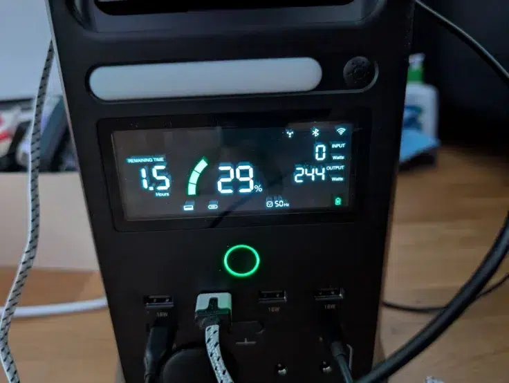 Für einen Beamer-Test (alter Epson-Beamer + Roku Streambar, gesamt ca. 244W) reichten 29% Restkapazität der Powerstation für ziemlich genau 1,5 Stunden. Lobend erwähnen muss man an dieser Stelle, dass gleichzeitiges Laden und Entladen möglich ist. Unsere De’Longhi Eletta Explore Kaffeemaschine mit über 1400 Watt lief tadellos, auch der leicht erhöhte Anlaufstrom beim Einschalten war kein Problem.
