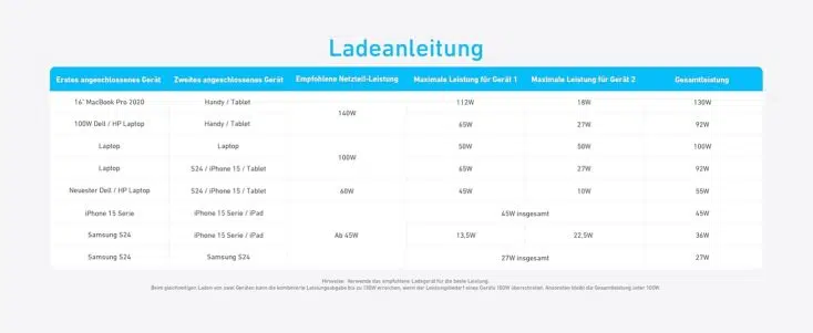 Dabei handelt es sich nicht nur um ein Ladekabel, sondern auch um ein Datenkabel mit bis zu 480 Mbit/s Datenübertragung. Kleiner Kritikpunkt: Eine schnellere Übertragungsrate nach neuerem USB-Standard wäre wünschenswert und zeitgemäß. Wichtig ist dabei selbstverständlich, dass ihr für die volle Leistung auch ein entsprechendes Ladegerät benutzt. Anker selbst hat nur eine 250W Ladestation mit 140W Port im Angebot, die Konkurrenz von UGREEN ist dabei etwas günstiger.