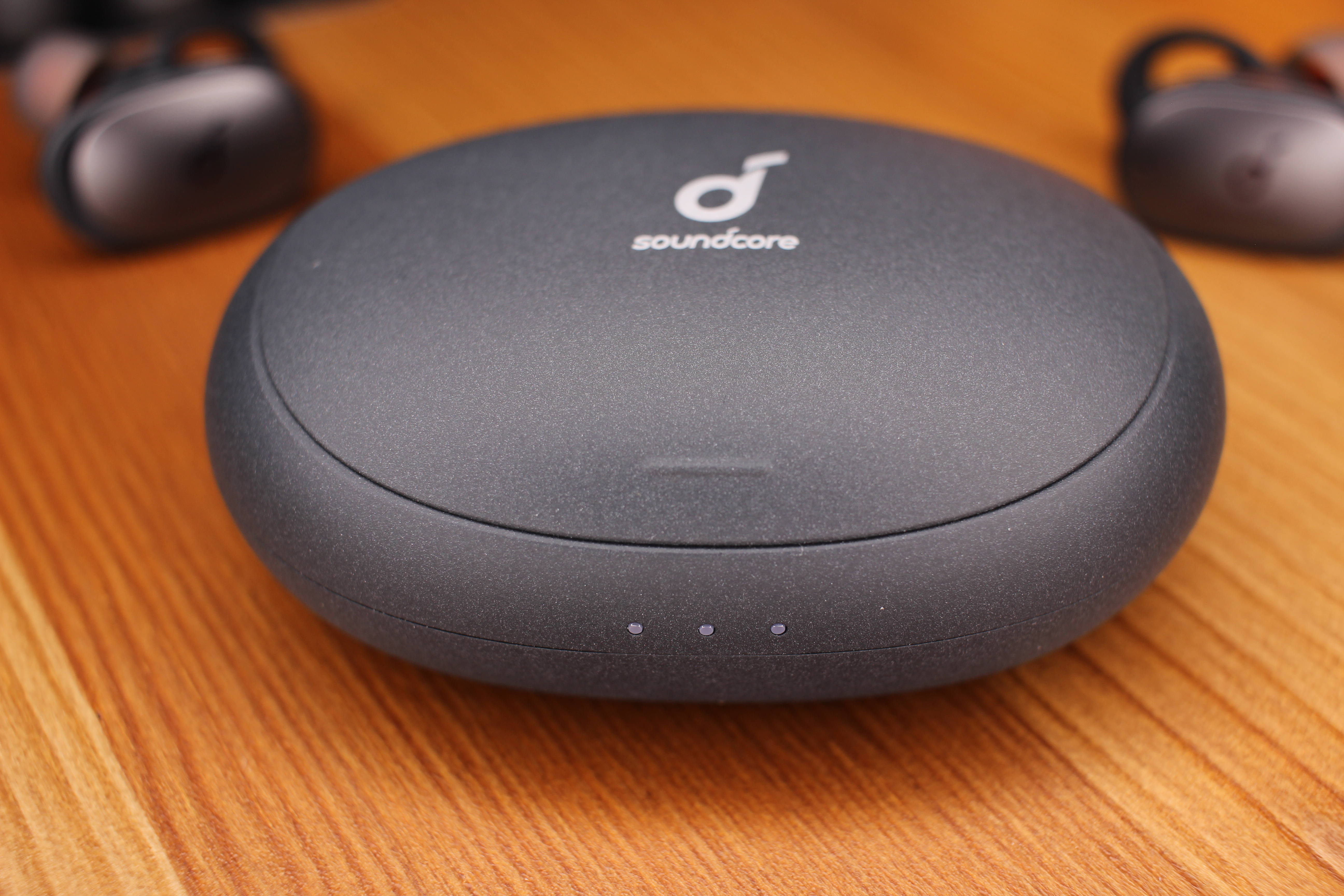Die Ladeschale ist mit den Maßen von 78,5 × 57 × 5,4 mm oval, ähnlich wie die Hörer. Sie ist so zwar länglicher als die meisten Ladeboxen, aber auch etwas flacher und mit einem grauen Softlack versehen. Mir gefällt, dass sie die Form der Hörer wieder aufgreift und zudem einen schicken neuen Öffnungsmechanismus hat. Sie wird nämlich nicht aufgeklappt, sondern aufgeschoben.