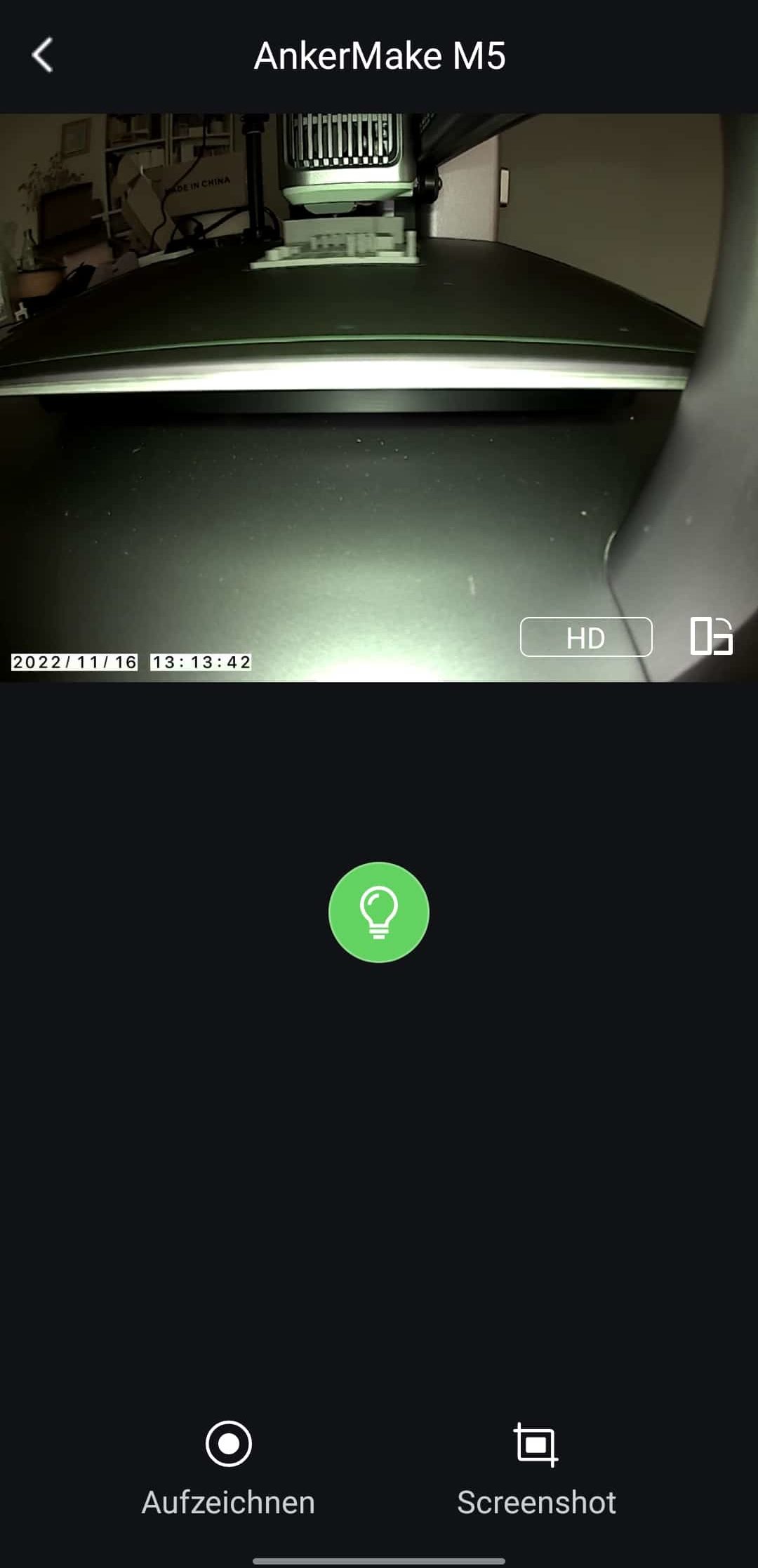 Die 1080p-Kamera bietet ein gutes Bild des Druckbett-Geschehens – auch wenn ihr Aufnahmewinkel manchmal keine idealen Streams erzeugt. Sie lässt sich über das Kamera-Icon in der App gleich unter dem schematischen Bild des AnkerMake M5 aktivieren. Screenshots und Aufnahmen können getätigt werden. Zudem lässt sich die Auflösung des Streams verringern oder das ganze Bild, in dem Datum- und Zeitstempel integriert sind, ins Querformat bringen. Tagsicht und Nachtsicht via Infrarot-Funktion sind an Bord. Ist es dann doch zu dunkel, lässt sich ein Licht hinzuschalten – sehr cool. Schade finde ich aber, dass die Kamera bisher nur über die App und noch nicht über den Slicer funktioniert.