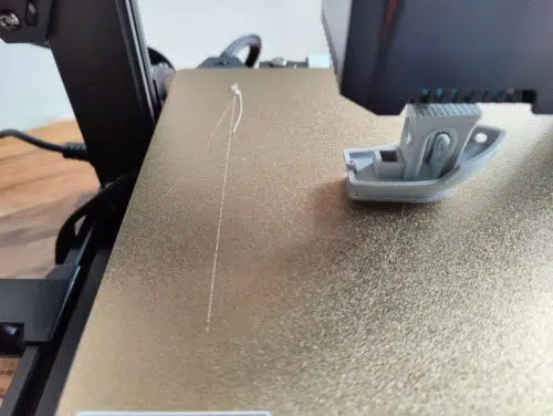 Frei von Schwächen ist Anycubics LeviQ 2.0 nicht. Zwei Punkte fallen hier auf: Erstens: Fast immer bleibt ein Filamentstreifen nach dem Extrudieren von Material auf der PEI-Platte zurück. Der Silikonblock soll als Abstreifhilfe fungieren – davon sieht man aber überhaupt nichts. Warum die Düse dann längere Zeit auf dem Block verweilt, erschließt sich mir auch nicht.