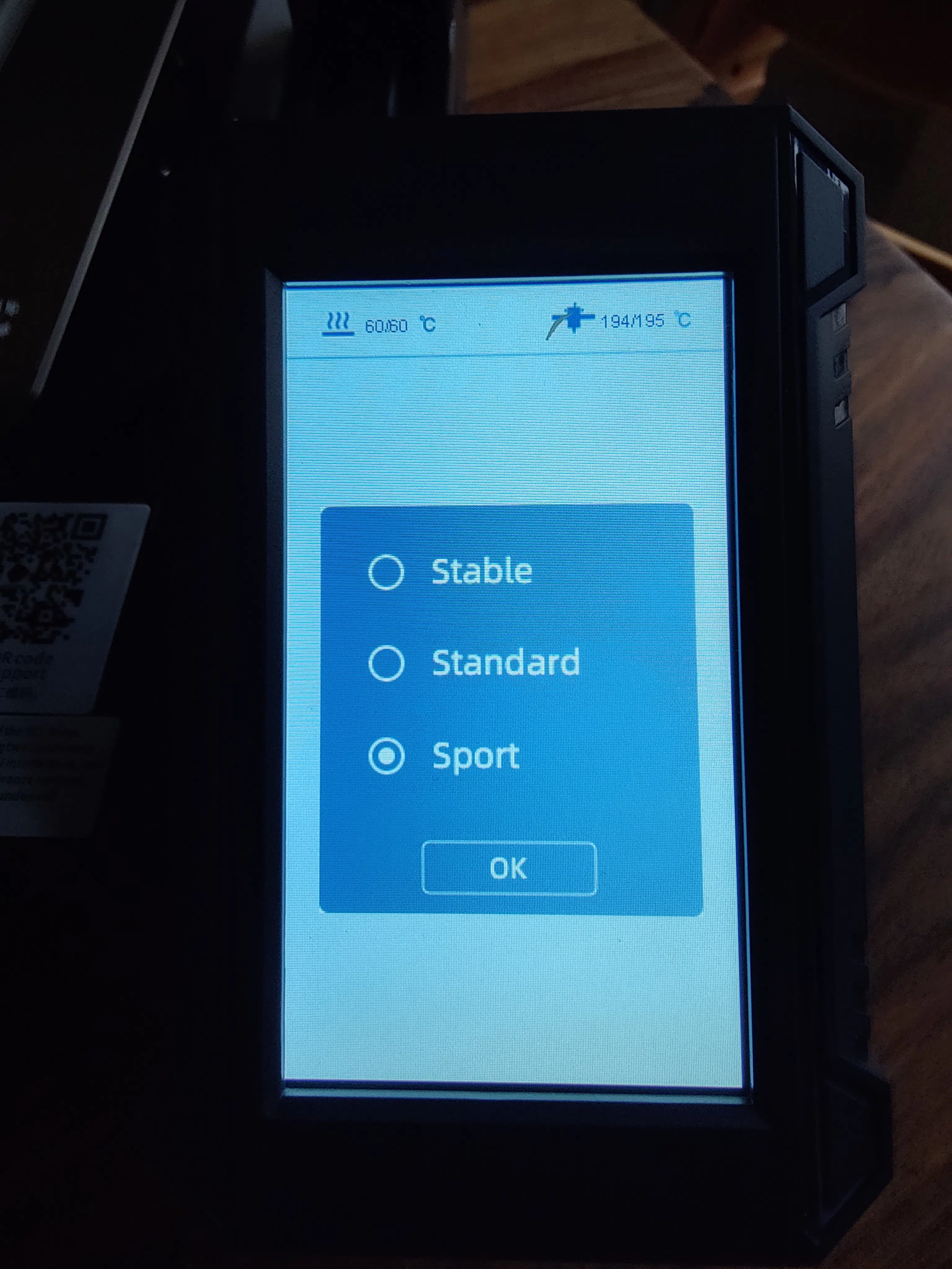 Aus Neugier wähle ich während des Drucks einen anderen Geschwindigkeitsmodus, denn im Menü lassen sich 3 verschiedene Modi nutzen: Stable (80%), Standard (100% = 150mm/s) und Sport (120%). Die Freude über den wirklich schnellen Druck im Sport-Modus hält nur kurz: Ein starkes Vibrieren und knarzende Töne aus dem Y-Achsenmotor sorgen dafür, dass ich schnell wieder auf den Standardmodus zurückgehe.