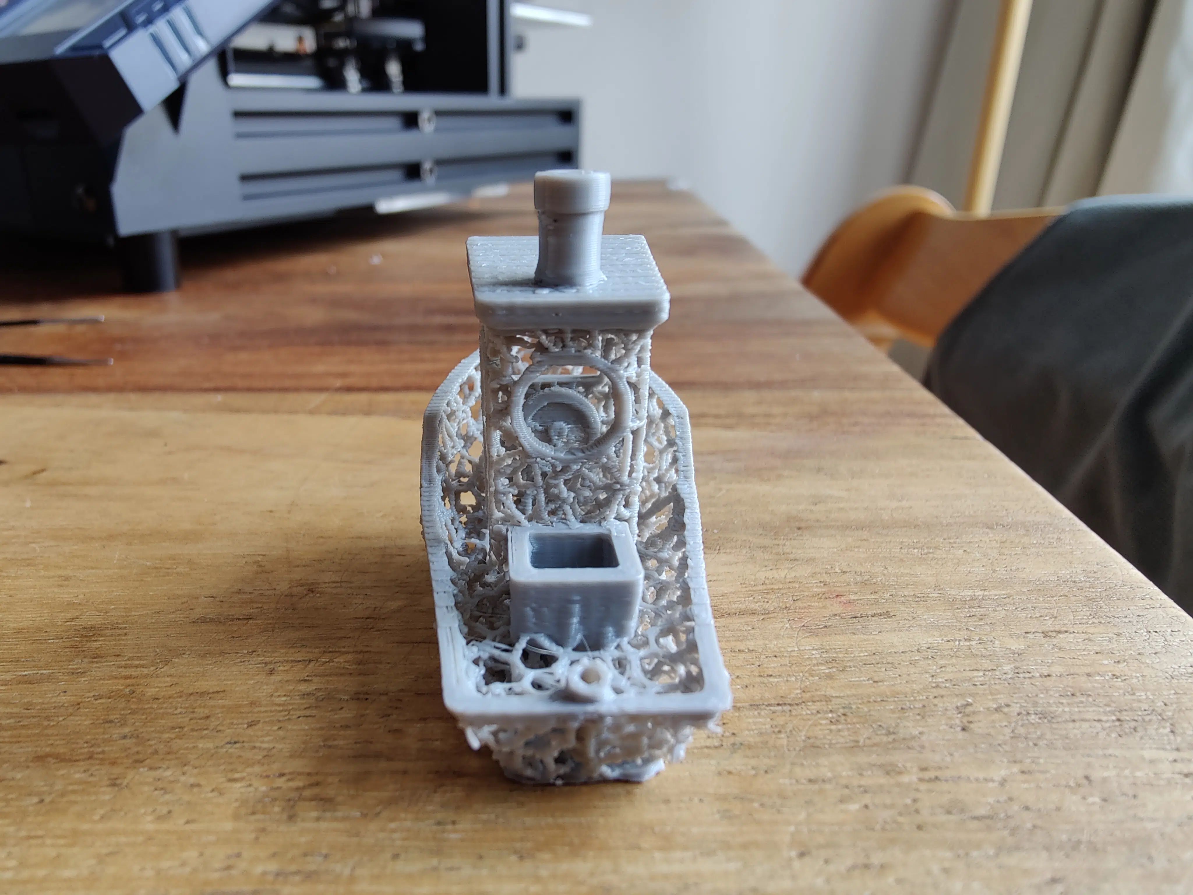 Als nächstes kommt das übliche Voronoi-Benchy als Torture-Test dran. Nach 1 h 20 m ist es bei 185 zu 60 Grad bei einer Druckgeschwindigkeit von 150mm/s fertig und offenbart Probleme mit der Kühlung bei Überhängen. Viele der Verästelungen führen ins nichts. Hier konnte beispielsweise der Ender-5 S1 deutlich besser performen.