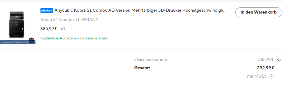 Den Anycubic Kobra S1 Combo (mit Multicolorsystem ACE Pro) erhaltet ihr zum Allzeit-Tiefstpreis im Rahmen der Singles-Day-Aktion für nur 292,99€ bei AliExpress direkt aus Deutschland. Nutzt dazu unseren Gutschein GADGETS60 und zahlt mit Paypal für 33€-Extra-Rabatt!