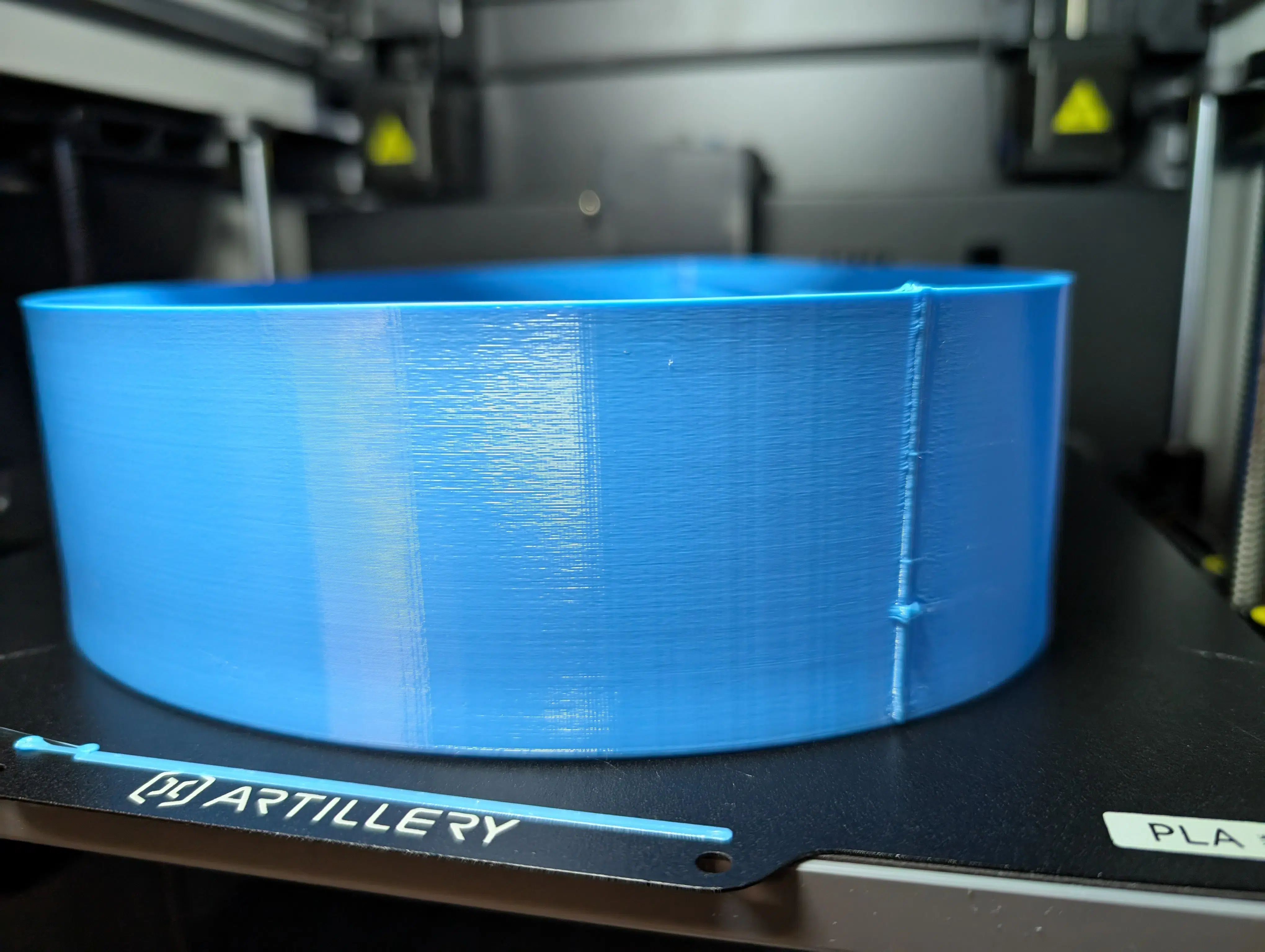 Zum Schluss drucken wir noch einen Staubbehälter für die Absaugstation unseres Saugroboters. Dazu nutzen wir ABSx von Nobufil ebenfalls mit Standardeinstellungen im Slicer für Generic-ABS. Nach 7,5 Stunden Druckzeit zeigten sich die Grenzen der Mechanik. Neben Warping an den Ecken (trotz Einhausung) ist die Oberfläche unruhig (kleine Löcher, Layer-Cracks). Wir sehen zudem deutliche VFAs (Vertical Fine Artifacts).