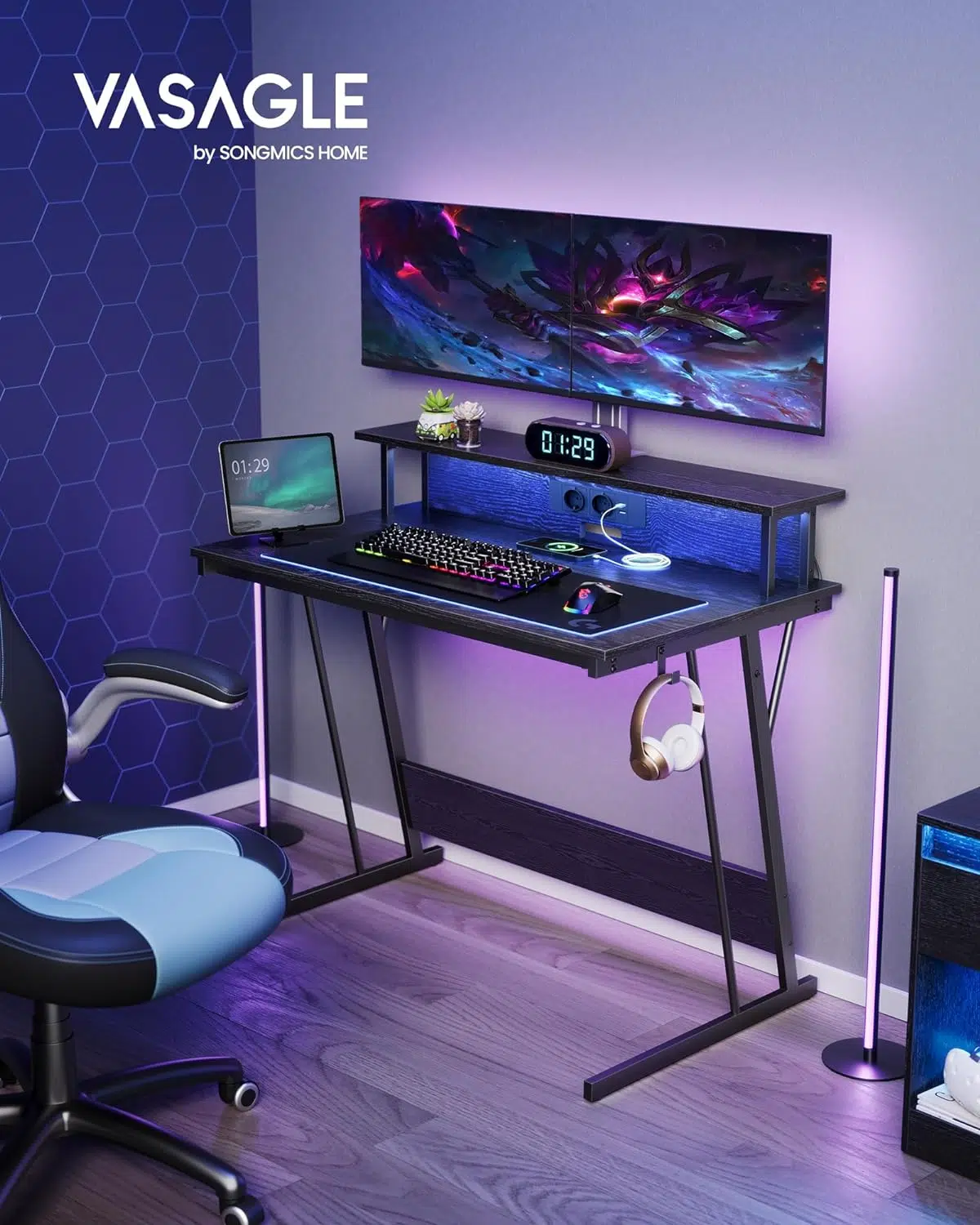Wenn etwas in der Gaming-Sparte auf den Markt kommt, dann darf natürlich auf keinen Fall die bunte LED-Beleuchtung fehlen. Dieser kleine Gaming-Schreibtisch von SONGMICS Vasagle ist relativ klein, bietet aber ein paar praktische Halterungen und die angesprochene farbliche Beleuchtung.