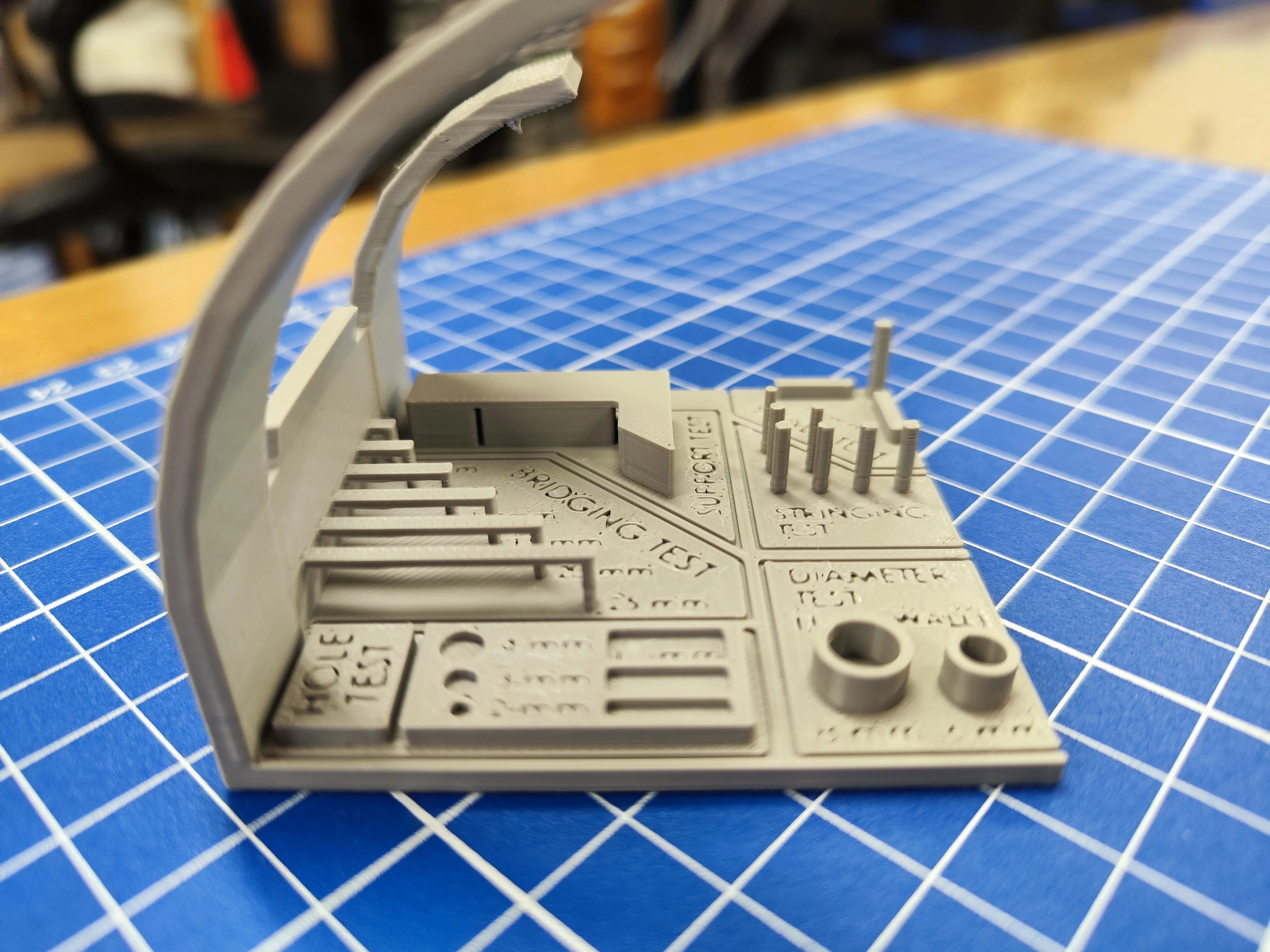 Auch der All-in-One Test nach ca. 01:47 h kann überzeugen: Das Bridging – also das horizontale Drucken in der Luft – beherrscht der Bambu Lab A1 Mini genauso gut wie kleine Details (Türmchen). Die Überhänge werden bis ca. 70° sauber gedruckt. Auch der Text auf der Druckoberfläche ist gut lesbar.