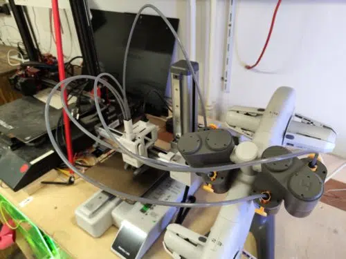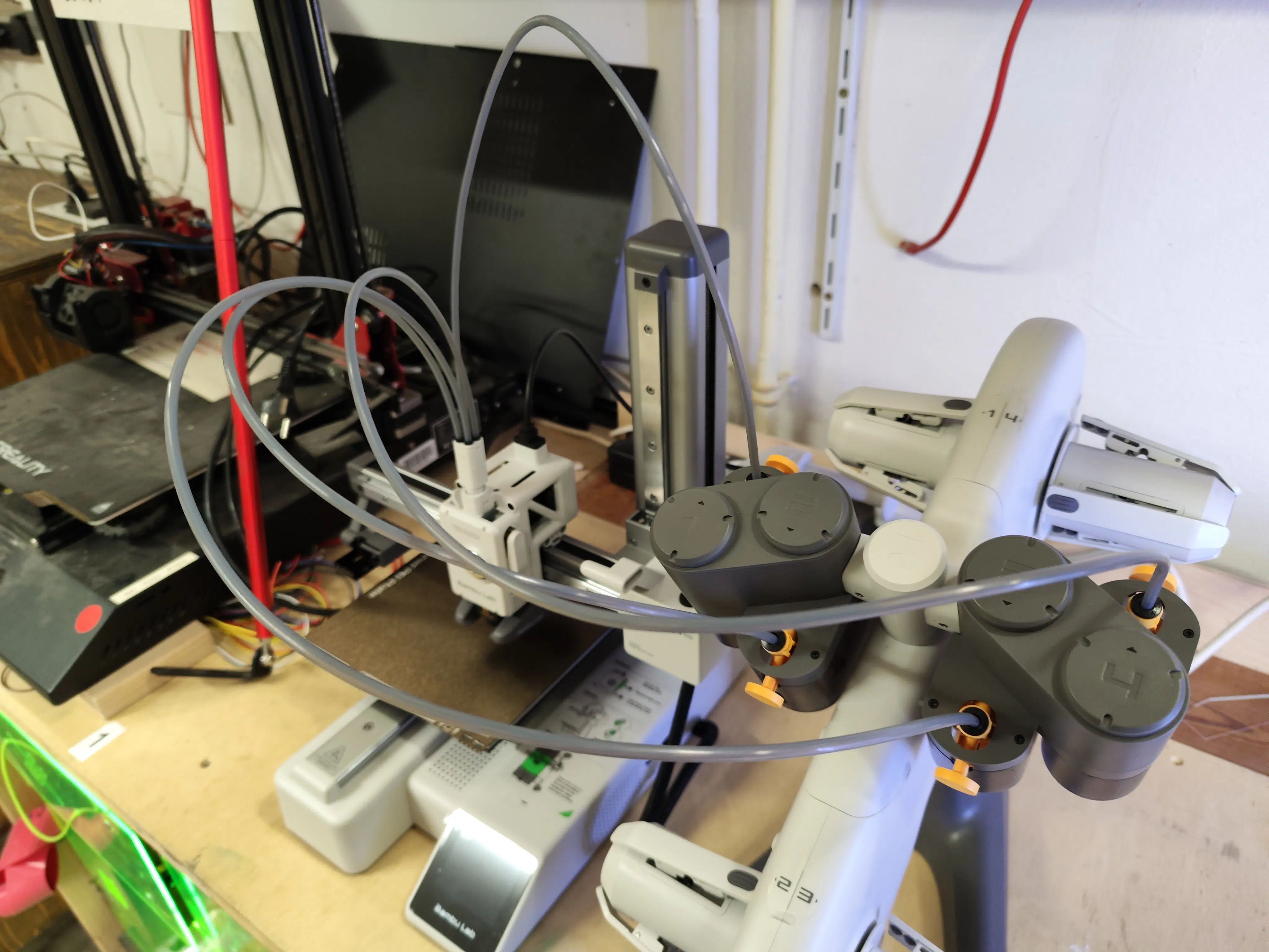 Traditionell kann man das weiche gummiartige TPU nicht im AMS nutzen. Das gilt auch für das AMS Lite. Deshalb kommt dann der Filamenthalter hinten an der Z-Achse zum Zuge, der in der Software auch als „externer Filamenthalter“ geführt wird. Kleines Bequemlichkeitsproblem: Es gibt nur 4 Slots oberhalb des Druckkopfs. Will ich also den hinteren Filamenthalter nutzen, muss ich einen gesonderten PTFE mit einem der 4 Schläuche zum AMS Lite tauschen. Hier hätte ich mir eine fünfte Öffnung am Druckkopf gewünscht.