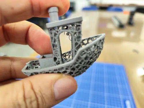 Auf dem Testparcours-Plan steht nun das Voronoi-Benchy (identische Einstellungen für Filament und Druckzeit). Ich wundere mich über die verhältnismäßig lange Druckzeit von über 2 Stunden. Grund: Die Standard-Timelapse-Funktion ist aktiviert, weshalb der Druckkopf für schöne Timelapse-Snapshots während des Drucks ständig nach links zum mechanischen Filamentabstreifer fährt. Das wirkt sich negativ auf das Druckbild aus, gibt es doch deutlich mehr Filamentreste in der Luft, Stringing und Artefakte allgemein.