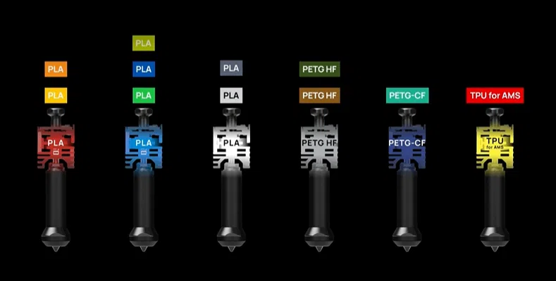 Über das Vortek-System kann der H2C bis zu 7 Farben/Materialien fast ohne Abfall drucken. Wenn man das klassische Purge-System mit dem AMS 2 Pro nutzt, sind sogar bis zu 26 Farben möglich.