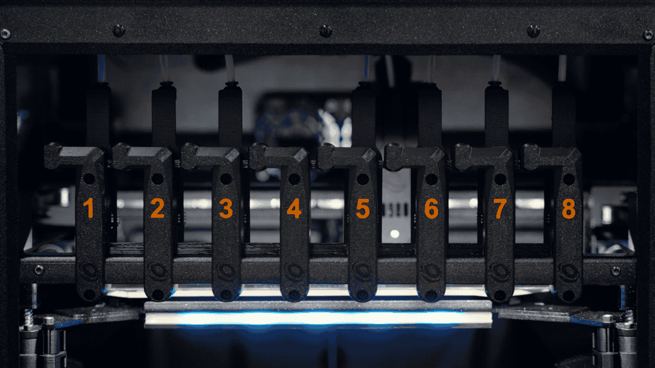 Dieser smarte Kopf bedient sich aus einem Pool von bis zu acht „dummen“, passiven Werkzeugen. Diese Werkzeuge sind im Grunde nur die Düsen selbst – ohne eigenes Hotend oder Kabel. Der smarte Kopf dockt an die benötigte Düse an und heizt sie ebenfalls kontaktlos per Induktion in Sekundenschnelle auf.