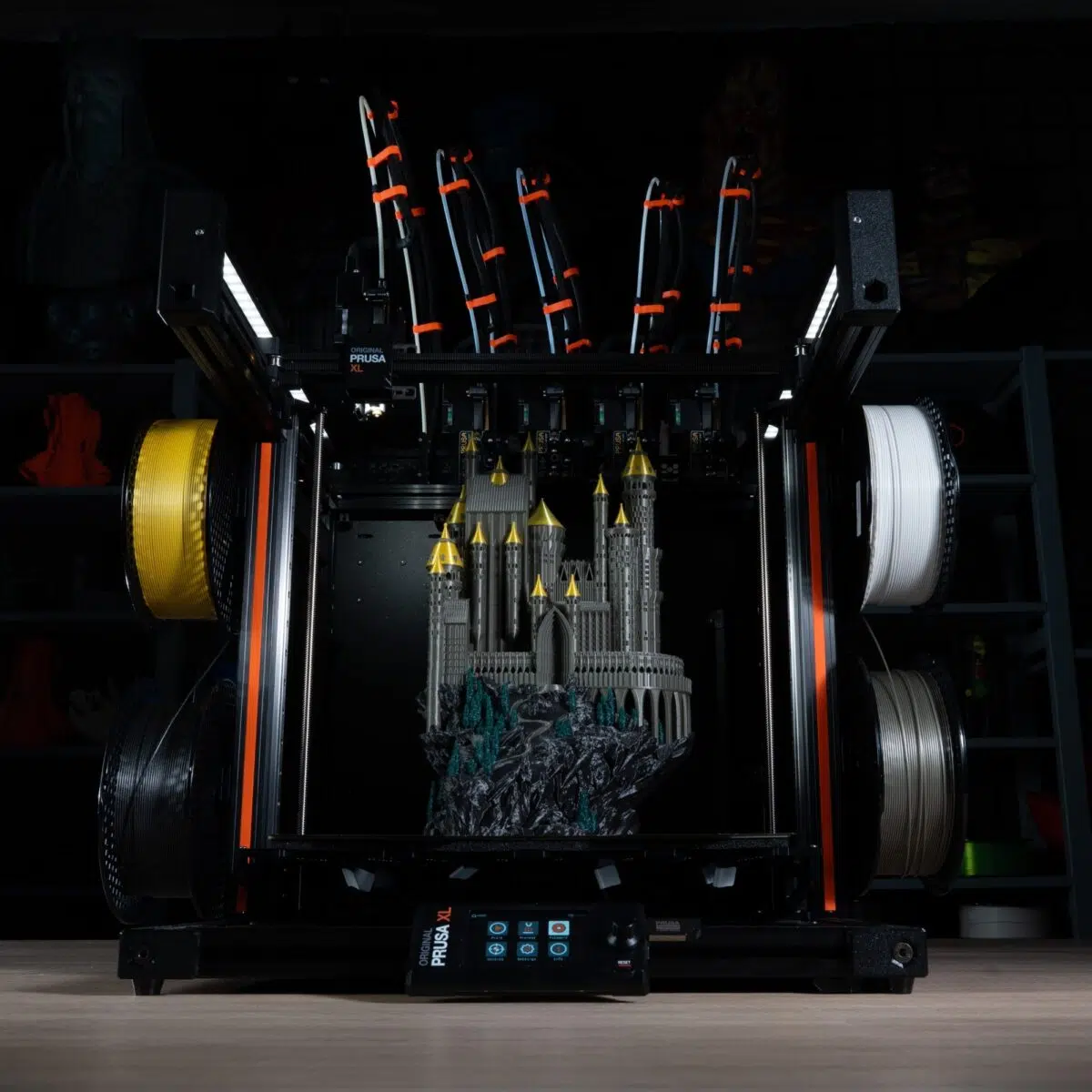 Um die neuen Systeme einordnen zu können, müssen wir uns den aktuellen „Goldstandard“ für abfallarmen Mehrfarbendruck ansehen: klassische Toolchanger. Das prominenteste Beispiel ist der Prusa XL. Hier fährt der gesamte Drucker-Aufbau nach hinten und wechselt den kompletten Druckkopf (Toolhead), der bereits das geladene Filament und ein eigenes Hotend enthält. Dieser Ansatz ist extrem schnell, erfordert aber einen sehr großen Bauraum und eine massive, schwere Konstruktion.