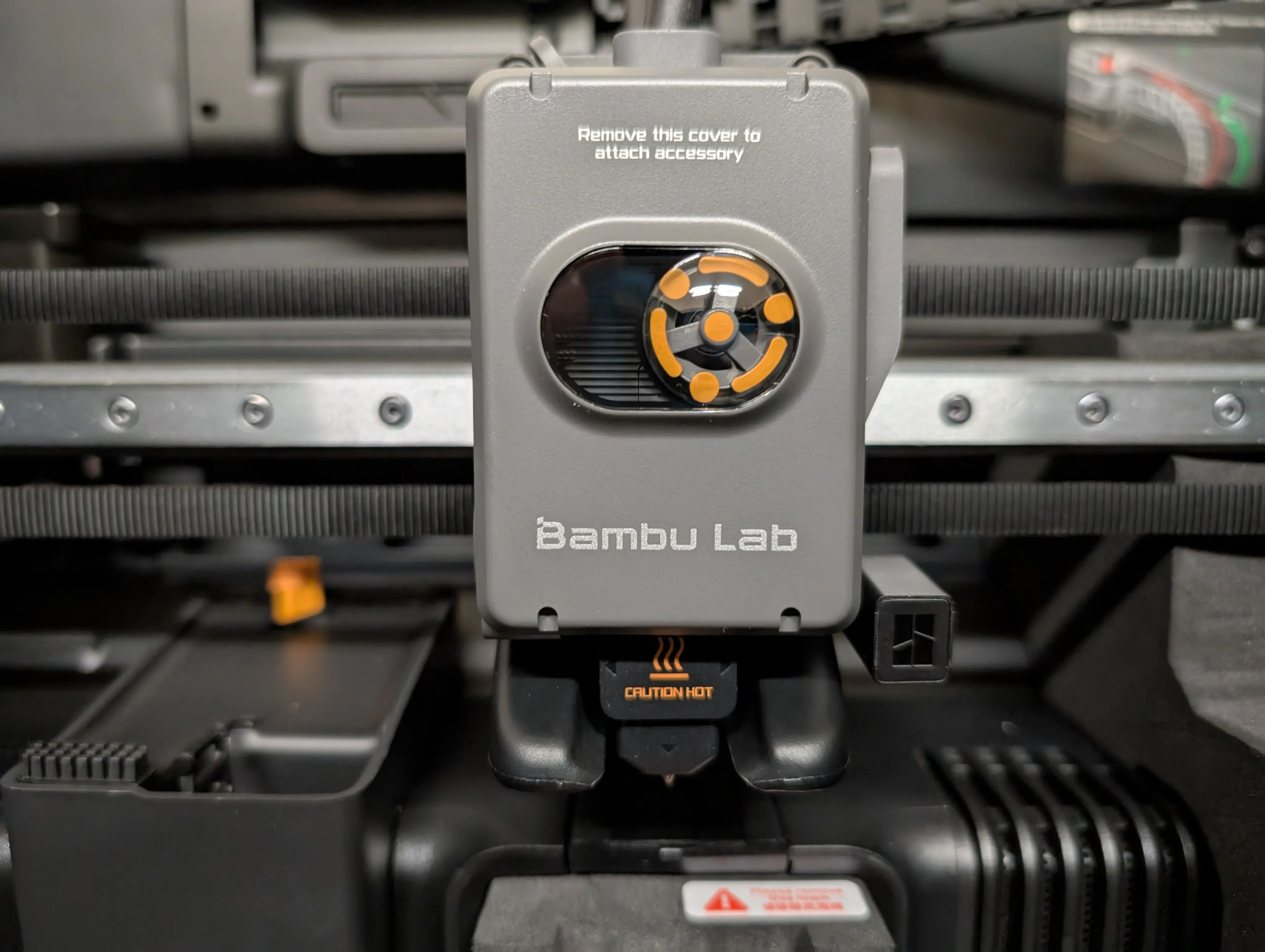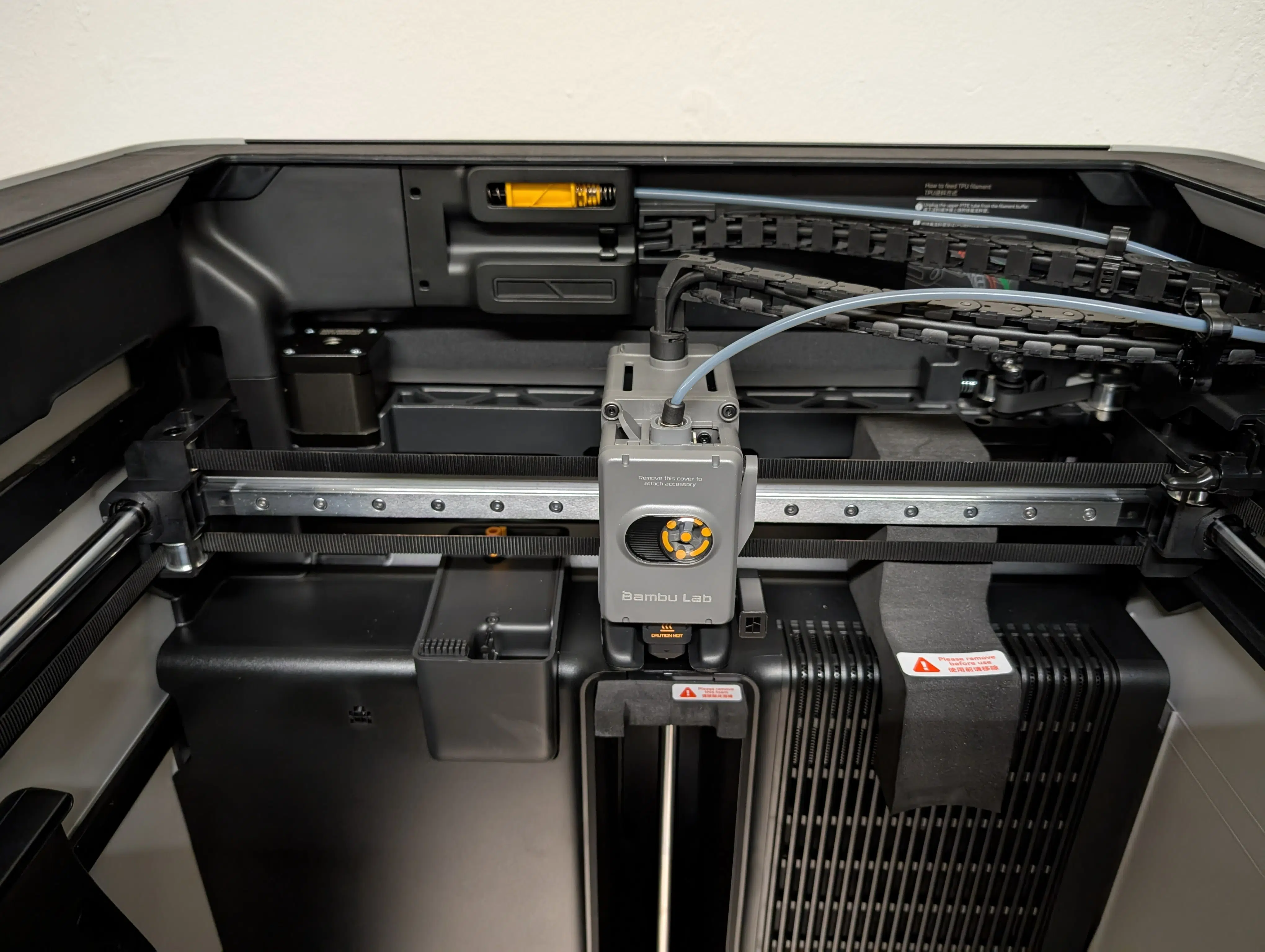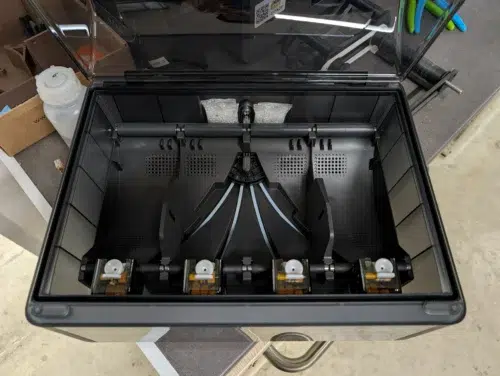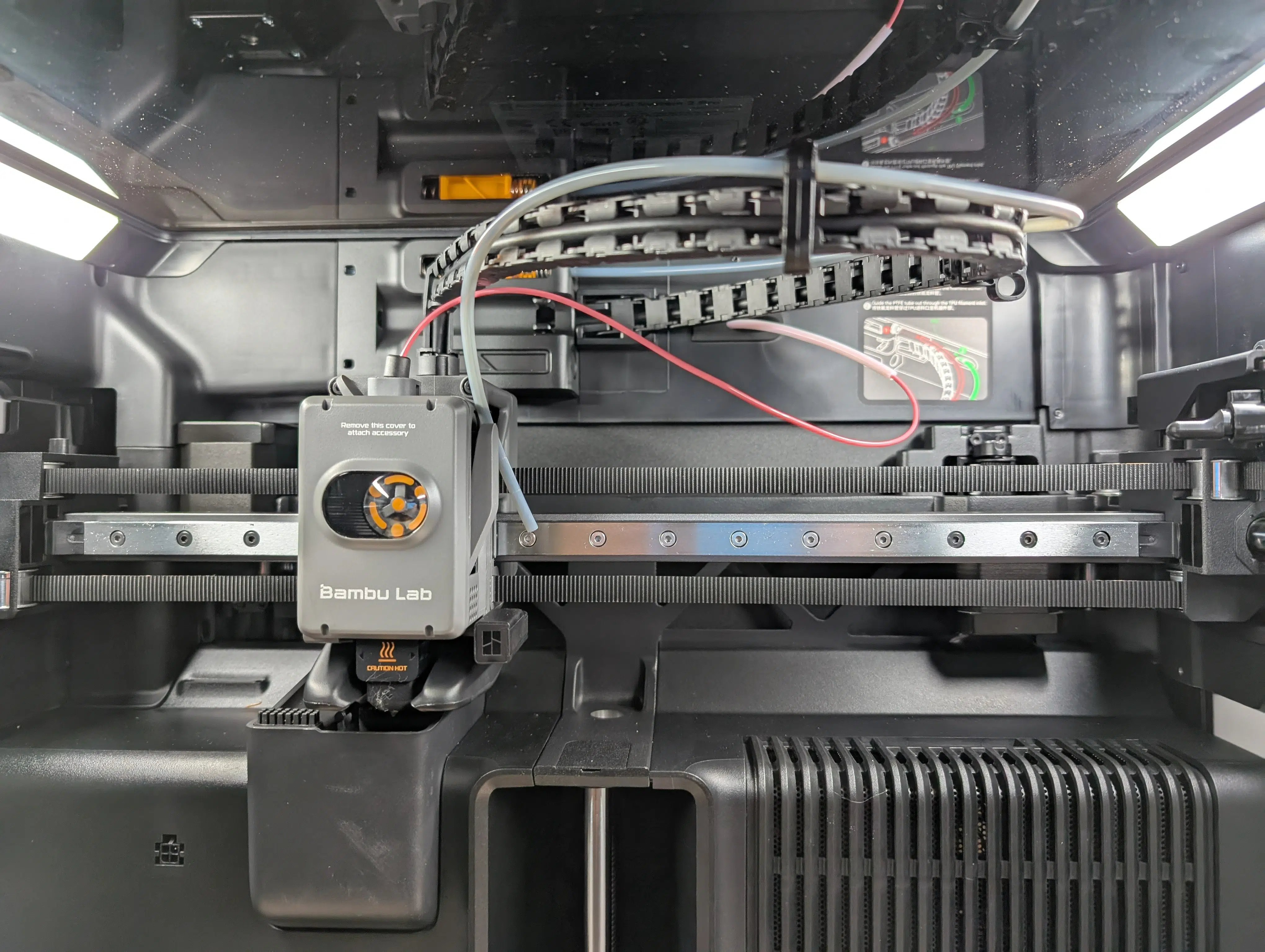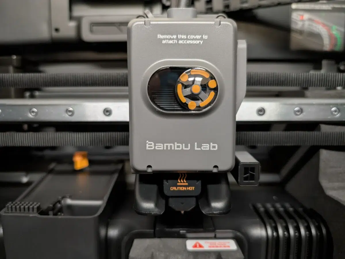 Bambu Lab hat hier mitgedacht und den zweiten PTFE-Eingang für das Dual-Hotend des H2D bereits mit einem Gummistopfen versiegelt. Man merkt an vielen Stellen: Das Chassis ist das des H2D, auch wenn auf die schicken Seitenfenster aus Kostengründen verzichtet wurde.