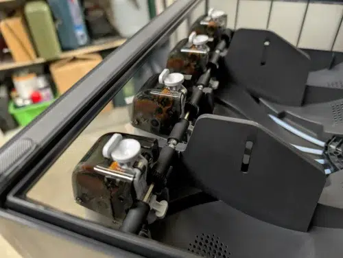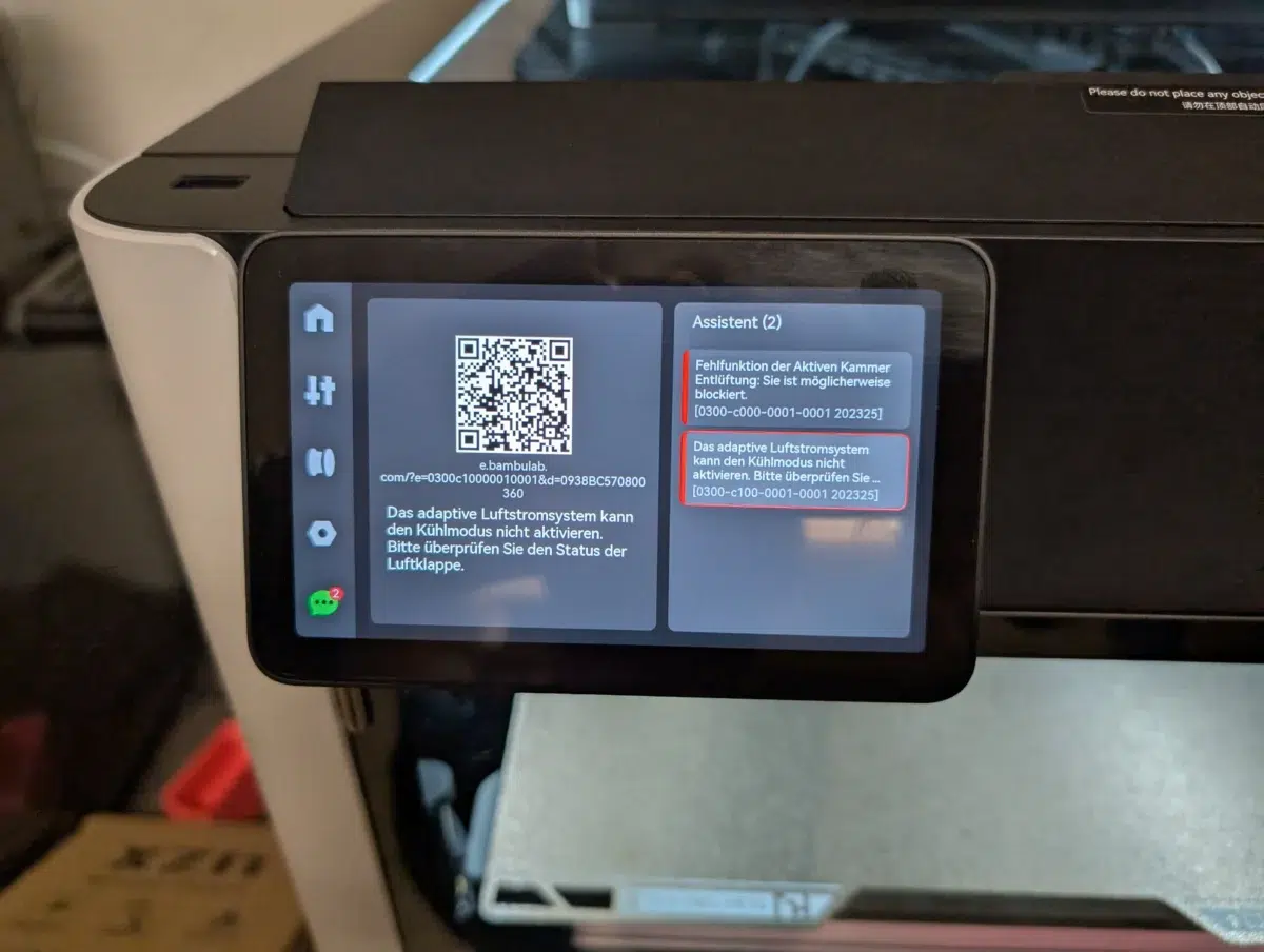 Eine Sache fiel uns dann aber doch direkt auf: Das HMS (Health Management System) meldete beim ersten Testdruck eine Blockade des automatischen Durchlüftungssystems. Die Lamellen an der Rückseite, die sich zur Belüftung öffnen sollen, schienen beim Transport etwas abbekommen zu haben und waren blockiert. Ein Problem, für das es im Bambu Lab Wiki zwar eine Anleitung gibt, das bei einem neuen Gerät aber natürlich ärgerlich ist. Unsere Testdrucke hat das aber nicht sonderlich gestört. Wir werden die Reparatur nach diesem Testbericht vornehmen.