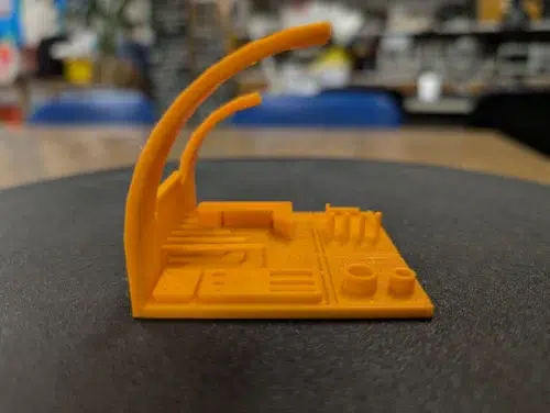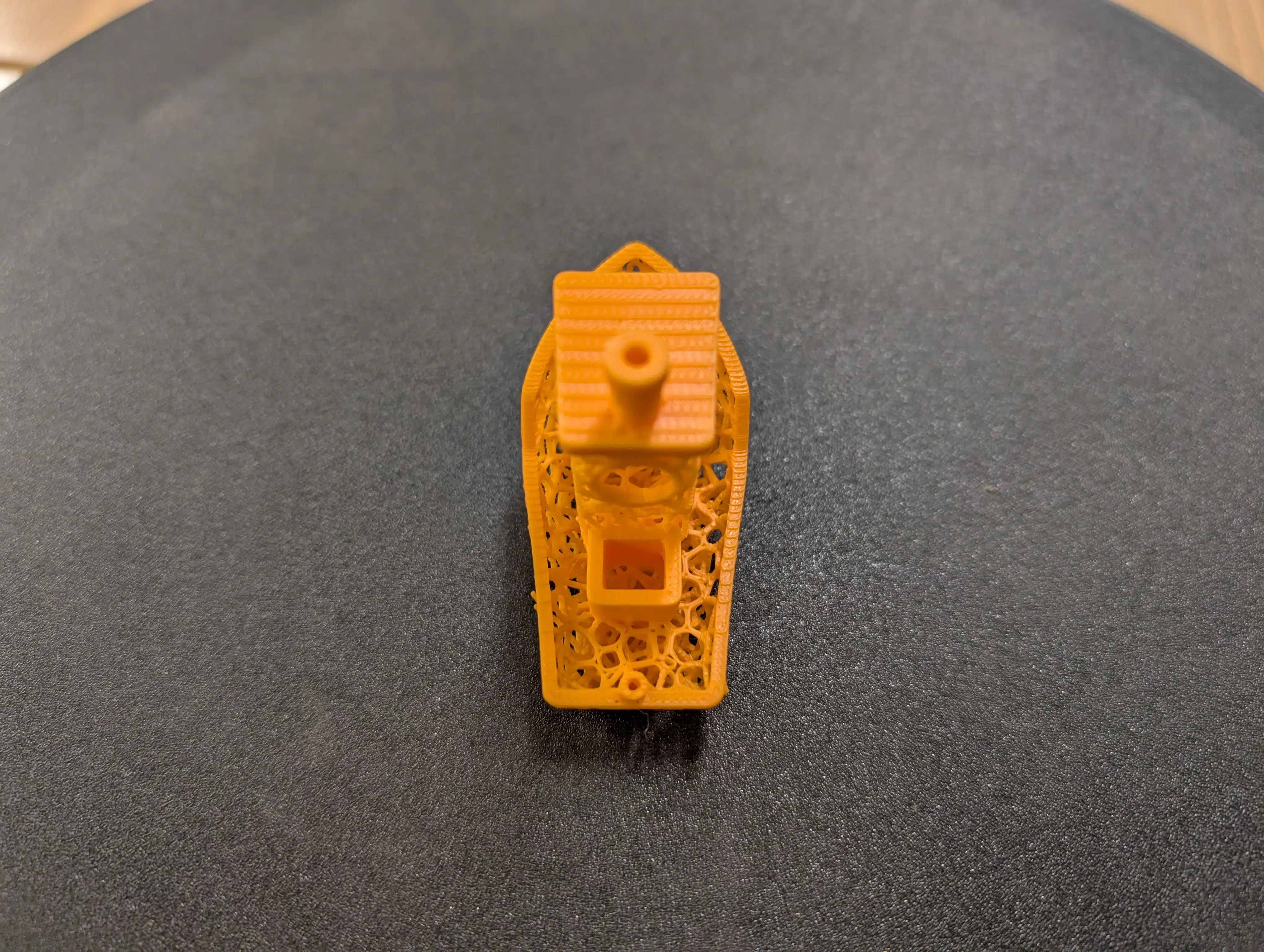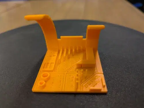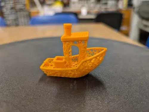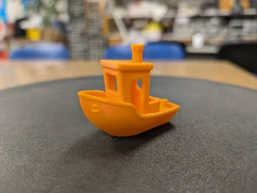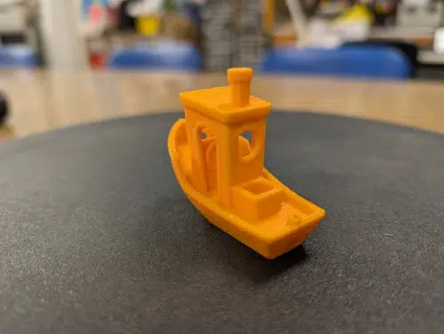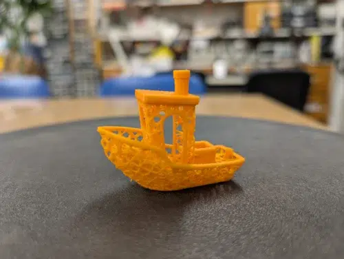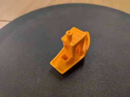 Ein Wechsel auf oranges PLA Basic von Bambu Lab lieferte ein deutlich besseres Ergebnis desselben Benchys. Minimale Druckfehler sind hier und da zu konstatieren, insgesamt handelt es sich aber um ein bis auf einen unschönen Türbogen fast „typisch“ gutes Benchy des Herstellers.