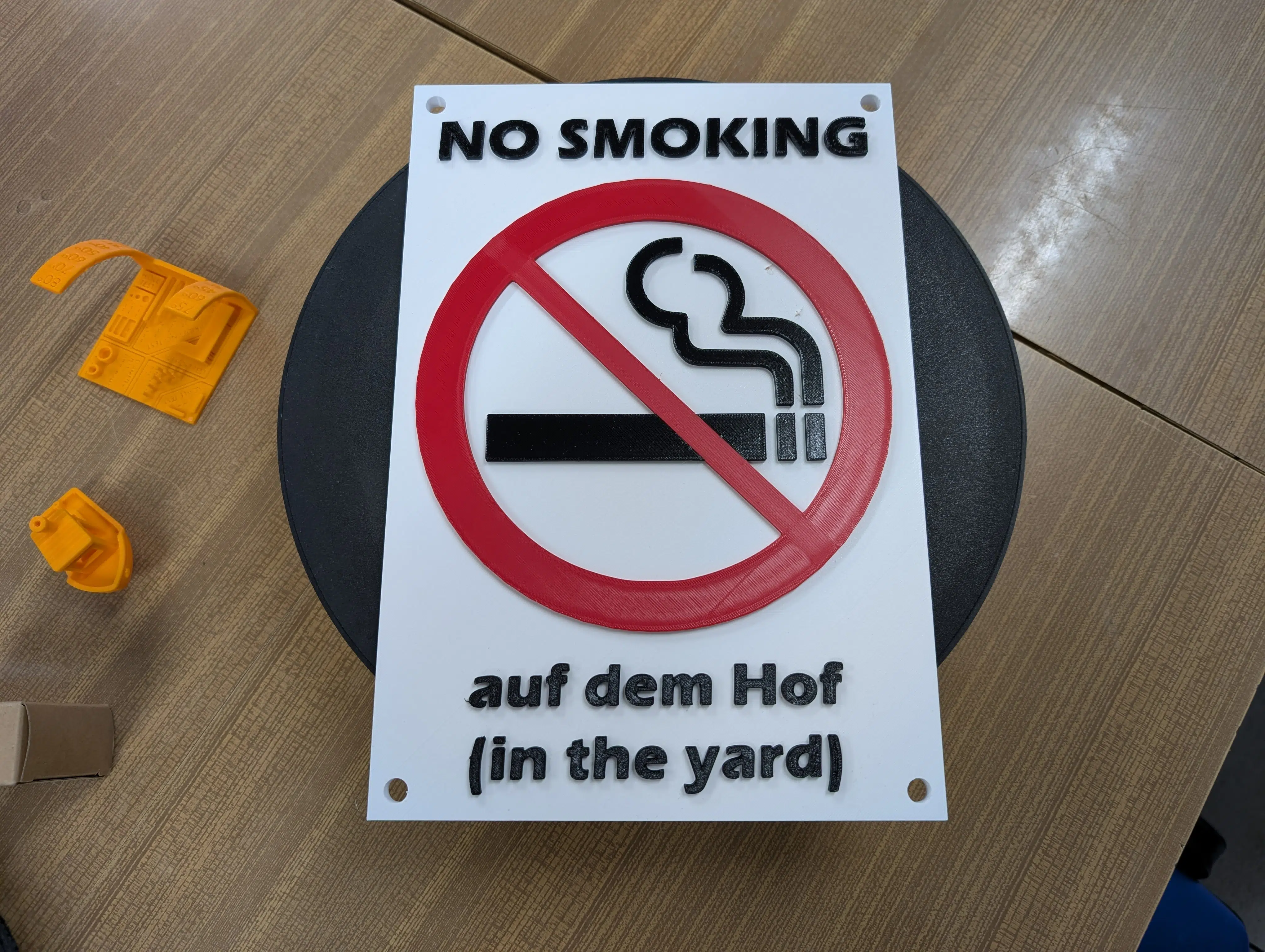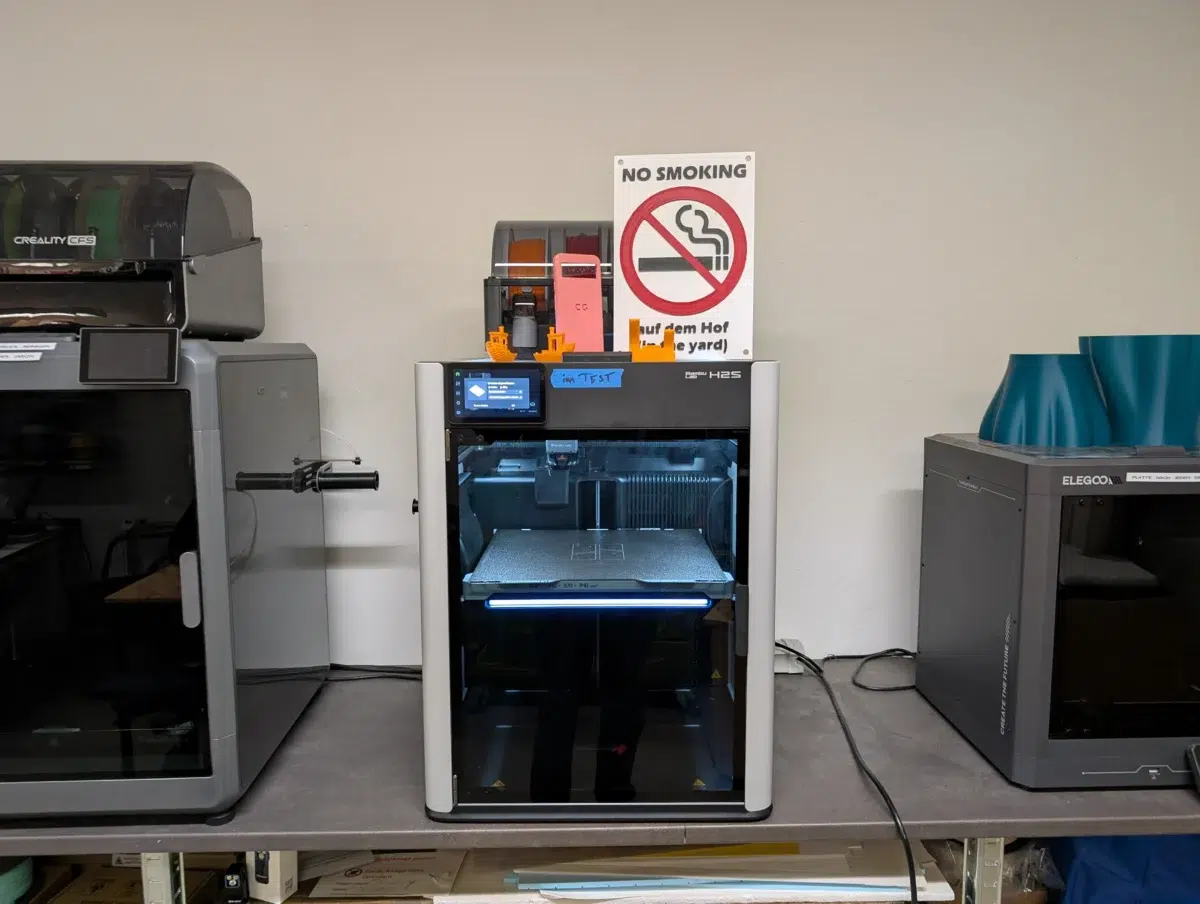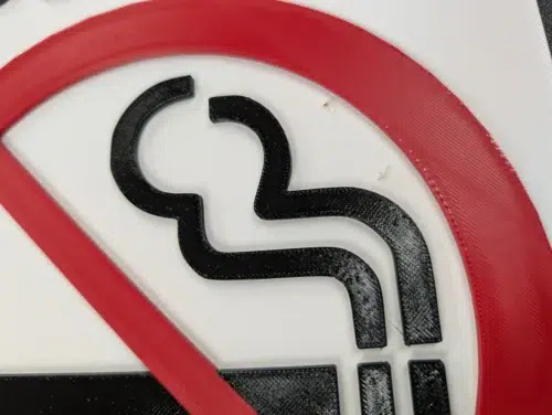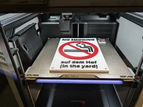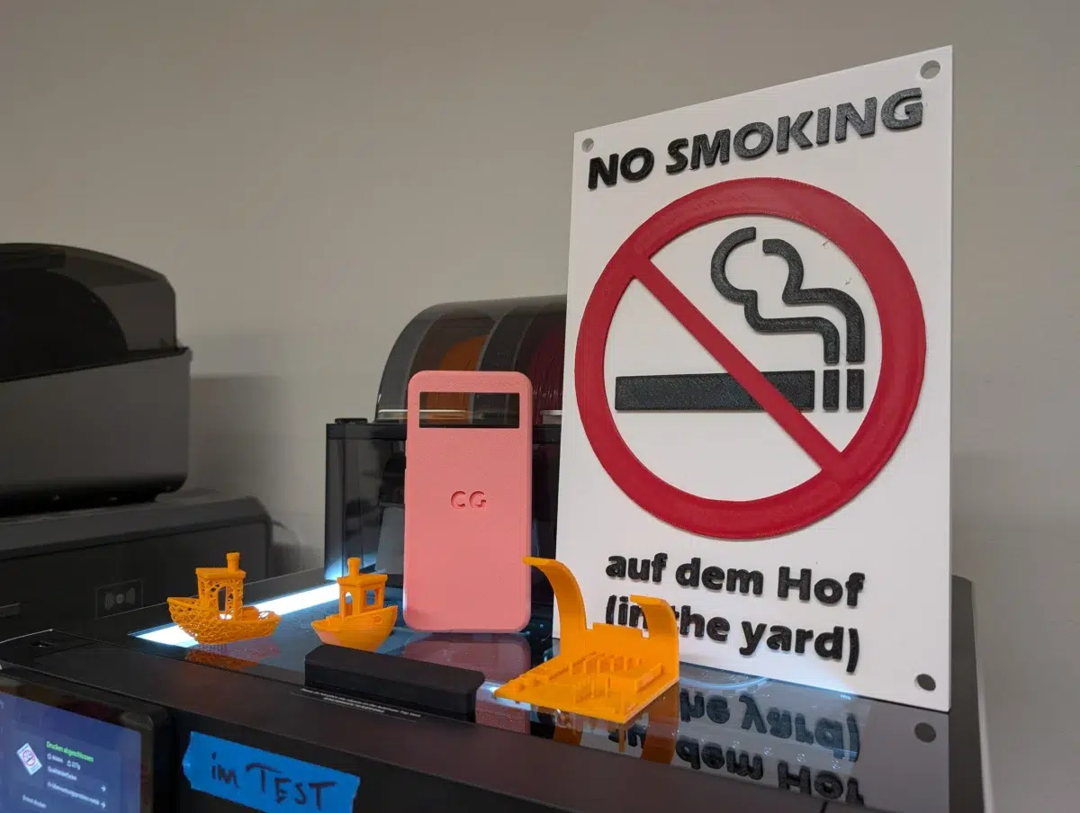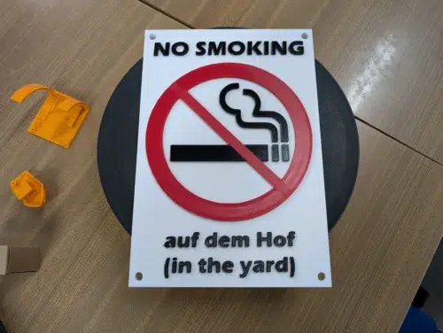 Der Multicolordruck mit PETG (ein „Rauchen verboten“-Schild) dauerte stolze 4 Stunden und 46 Minuten. Zum Einsatz kamen eSun PETG HF (rot), XZN PETG (schwarz) und Bambu PETG HF (weiß). Das Ergebnis ist ebenfalls gelungen, mit nur minimalen Fehlern im oberen rechten Bereich und etwas Stringing. Hier zeigt sich der systembedingte Nachteil des Single-Nozzle-Extruders: eine größere Menge an „Filament-Knödeln“ (Poop) durch die Farbwechsel.
