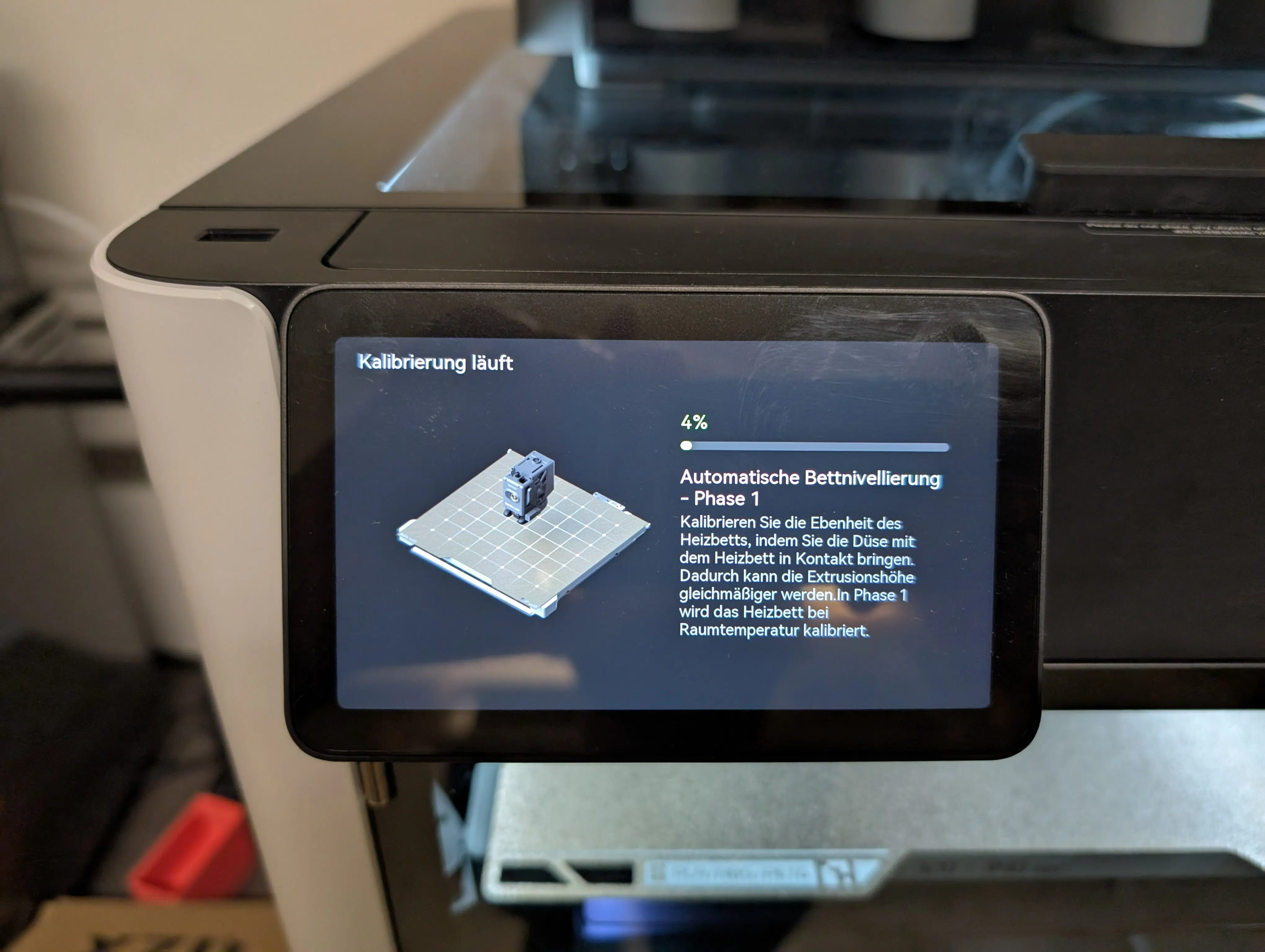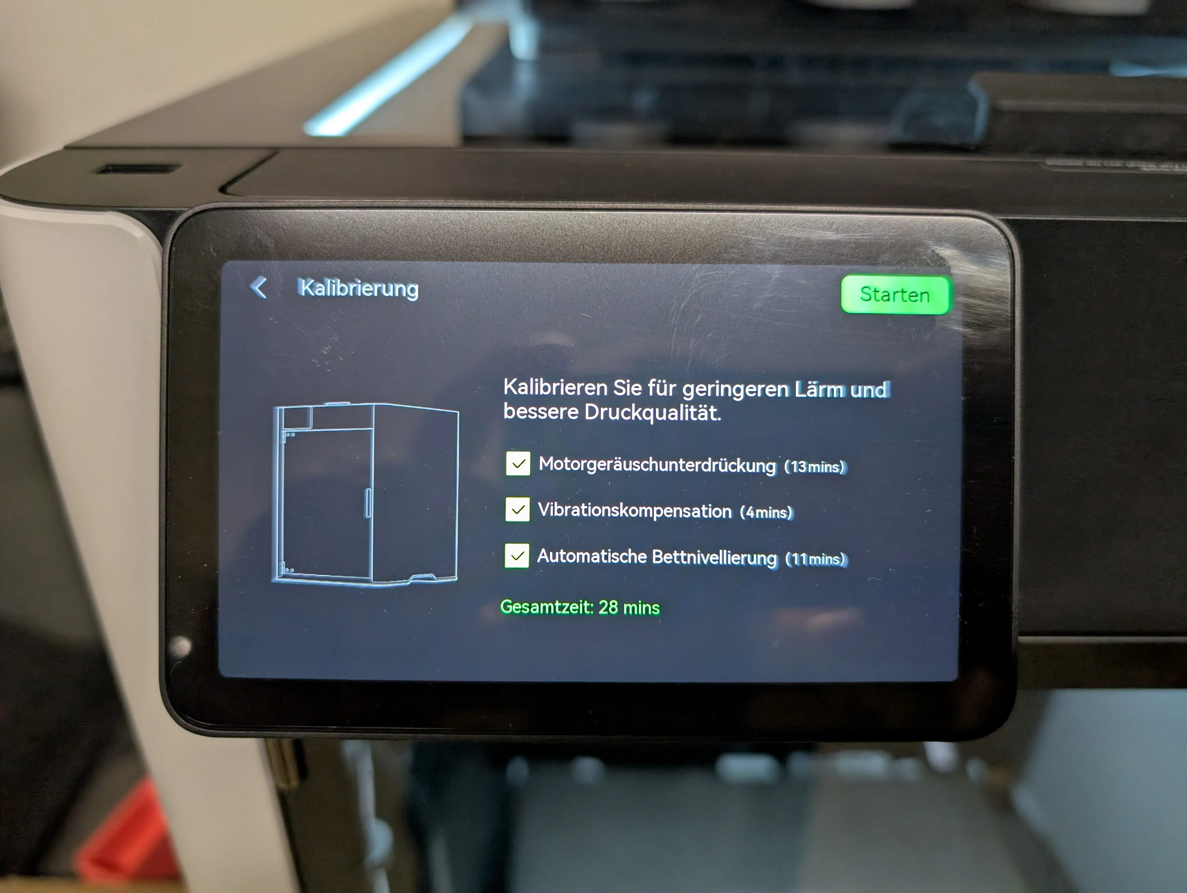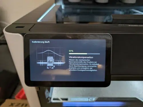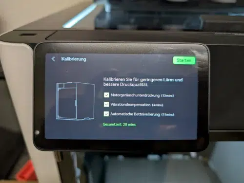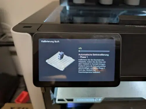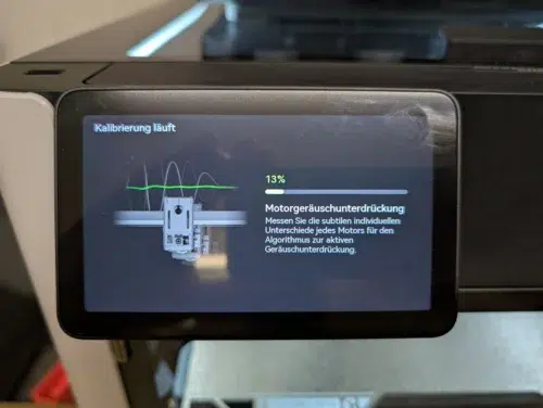Die Inbetriebnahme ist gewohnt einfach: WLAN einrichten, optional mit der App koppeln, und schon startet der Selbsttest. Dieser dauert zwar ganze 28 Minuten, ist aber extrem gründlich. Motorengeräusche werden reduziert, die Vibrationskompensation justiert und gleich zweimal ein Auto-Leveling durchgeführt (mit kaltem Druckbett und bei 55°C).