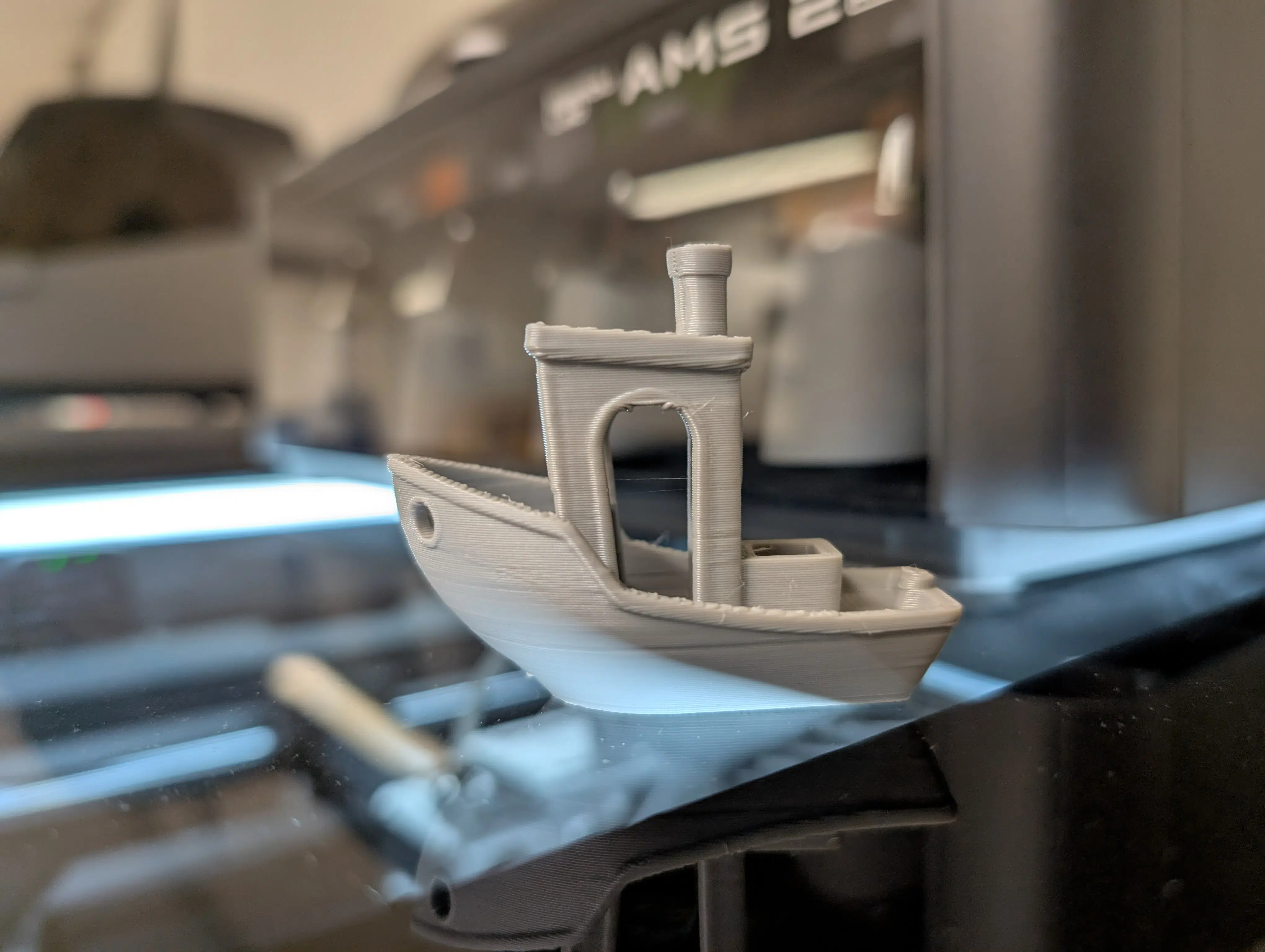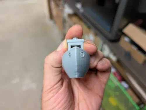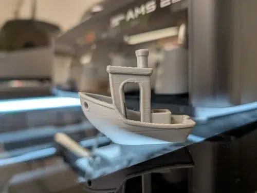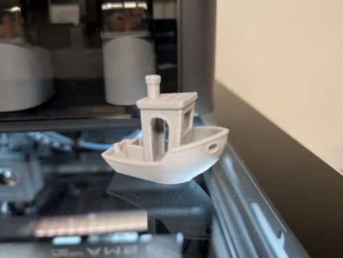 Alle Drucke fabrizieren wir mit absoluten Slicer-Standardeinstellungen. Wir starteten mit einem vorgeslicten 22-Minuten-Benchy und erlebten eine erste Ernüchterung: Mit grauem Soleyn-PLA von Creality zeigte das Ergebnis eine kräftige Delle am Bug. An dieser Stelle einmal die Frage an euch, liebe Community: Wie sind eure Erfahrungen mit Crealitys Soleyn-Filament?