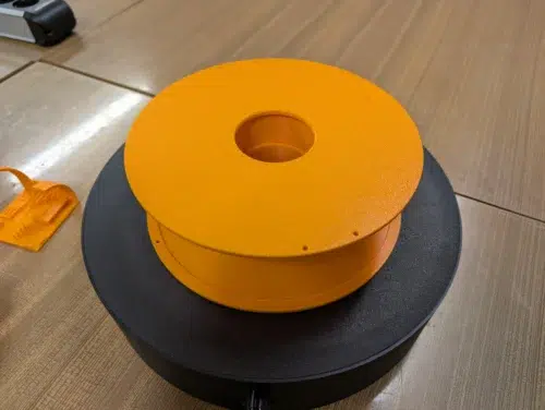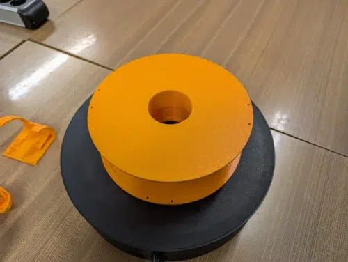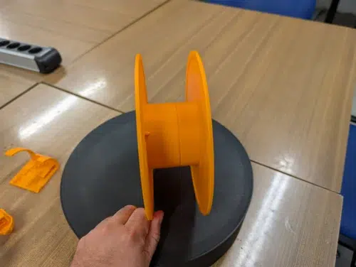 Anschließend druckten wir eine zweiteilige Filamentspule, die nach jeweils ungefähr 2h 20min so sauber aus dem Drucker kam, dass ein Kollege fragte: „Die ist aber nicht gedruckt, oder?“. Besser geht es kaum, aber seht selbst: