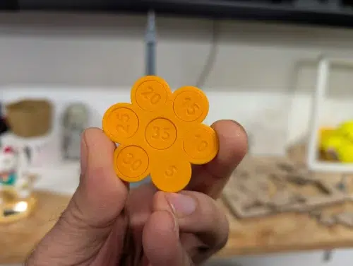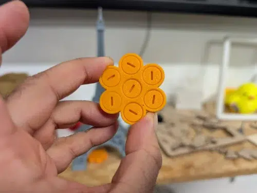 Den Toleranztest in Form eines kleinen Fidget-Spinners könnte man als „solide“ bezeichnen. Nach ca. 24 min kam der Druck allerdings nur mit einer akzeptablen Oberflächenperformance heraus. Die Rädchen lassen sich bis zu einem Abstand zwischen Rad und Modell von 0,25 mm ohne Probleme drehen, für 0,2 mm benötigen wir bereits einen Schlitzschraubendreher für das freie Drehen. Bei 0,15mm dreht sich dann nichts mehr. Das ist für einen 3D-Drucker ein guter Wert, beim H2S hätten wir nur mehr erwartet.