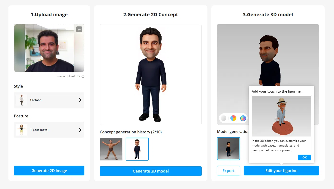 Und wir müssen sagen: Das klappt erstaunlich gut und vor allem schnell. Nach knapp 1 bis 2 Minuten hatte ich mein dreidimensionales Ich auf dem Schirm. Die Ähnlichkeit ist – typisch KI – manchmal verblüffend, manchmal eher „künstlerisch interpretiert“, aber für einen Ein-Klick-Prozess definitiv beeindruckend. Im Editor könnt ihr dann noch an der Bodenplatte feilen oder ein Namensschild hinzufügen.
