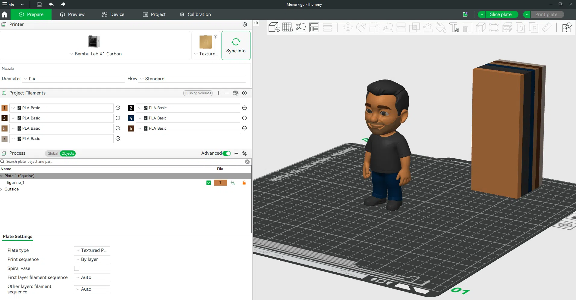 Wir haben die fertige Figur in den Slicer gepackt. Mit einem X1 Carbon würde das Drucken über 13h dauern. Hier wären Toolchanger-Drucker oder der neue Bambu Lab H2C klar im Vorteil.