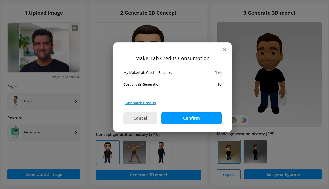 Bevor die Engine (basierend auf Tencent Hunyuan 3D) das 3D-Modell baut, generiert PrintU erst einmal ein 2D-Vorschaubild. Das ist clever, denn so seht ihr in wenigen Sekunden, ob die KI eure Brille oder den Bart richtig erkannt hat. Wenn das 2D-Bild passt, klickt ihr auf „Generate 3D“.