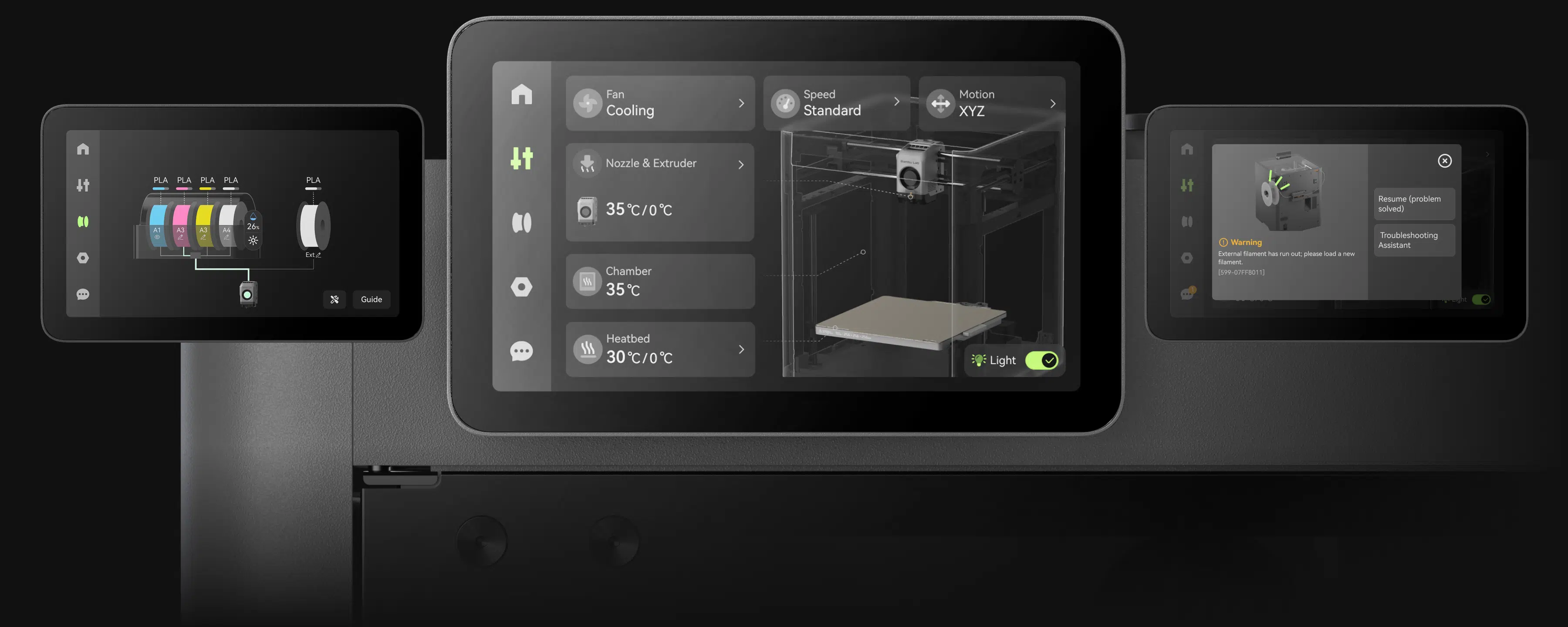 Die fummelige Bedienung über Tasten und ein kleines (schon damals gewöhnungsbedürftiges) Display gehören der Vergangenheit an. Der P2S erbt den großen 5-Zoll-Touchscreen und die intuitive, grafisch ansprechende Benutzeroberfläche der zweiten Generation (2nd-Gen UI) von den teuren H2-Modellen. Im Test des Bambu Lab H2S hat es uns diese Menüführung wirklich angetan.