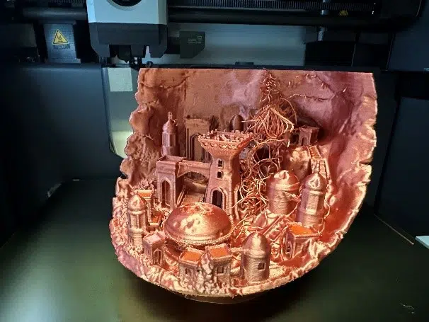 Man bekommt dann auch eine Nachricht aufs Handy. Grund war eine falsche Einstellung von mir im Slicer, was bei bestimmten Geometrien zu Problemen geführt hat (der Druck war noch zu retten, der mittlere Turm im rechten Bild unten hat jetzt halt kein Dach 😊).