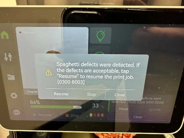 Außerdem gibt es die Spaghetti-Erkennung. Bei Erkennung eines Spaghetti-Haufens bekommt man eine Benachrichtigung und der Druck wird – je nach Einstellung – automatisch pausiert. Der Fall ist einmal bei mir eingetreten und es hat zwar etwas gedauert bis der Spaghetti-Fehler erkannt wurde, aber letzten Endes wurde der Druck pausiert und ich habe nachschauen können was los war.
