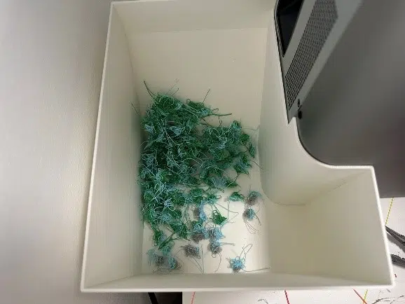 Es gibt einen eigenen „Platz“ für den Druckkopf, wo Material, das bei einem Filamentwechsel oder dem Druckstart gepurged wird, im Waste Bucket landet und anschließend hinten am Drucker herauskommt (Printer-Poo😊). Auch gibt es an der Stelle eine Abstreifhilfe für den Extruder, damit Filamentreste nicht im Druck hängen.