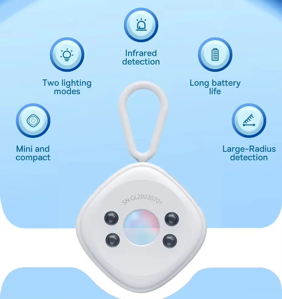 Wie funktioniert dieser Schlüsselanhänger nun in der Praxis? Viele dieser „Spionagekameras“ verfügen über ein Infrarot-Licht, um auch in Dunkelheit aufnehmen zu können. Durch die spezielle Linse in der Mitte könnt ihr dann sehen, wenn eine versteckte Kamera das Infrarotlicht reflektiert.