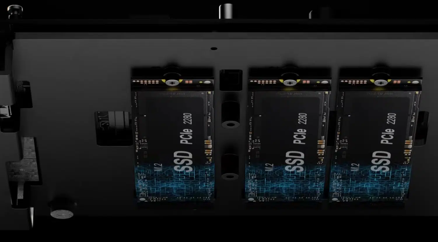 Für Daten-Messies wird es interessant: Beelink verbaut zwei klassische SATA-Schächte für große 3,5-Zoll-Festplatten (oder SSDs), die bequem von vorne zugänglich sind. Zusätzlich finden auf dem Mainboard gleich drei M.2 NVMe SSDs Platz.