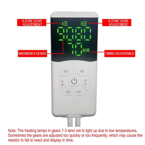Das Herzstück ist natürlich die Heizfunktion. Hier kommen gleich zwei Heizzonen zum Einsatz, die den Bereich der Hüfte (Sitzfläche) und der Taille (Rückenlehne) separat erwärmen. Gesteuert wird das Ganze über eine Kabelfernbedienung, mit der sich neun verschiedene Temperaturstufen einstellen lassen. Auf den Bildern ist diese aber leider nur auf Chinesisch.