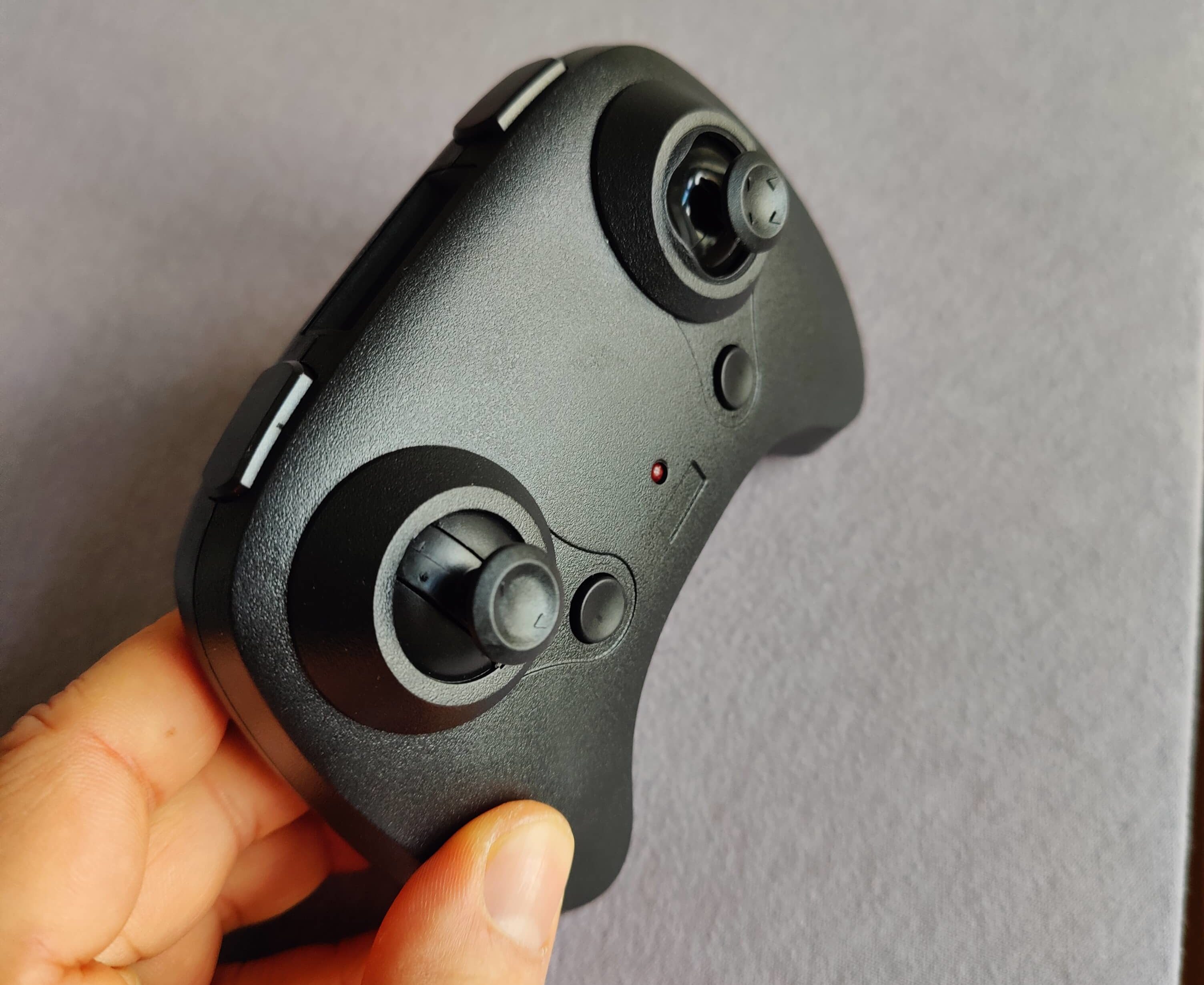 Die 2,4 GhZ-Fernsteuerung hat eine Reichweite von ca. 10 Metern. Sie ist im üblichen Mode 2 (Gas links, Lenkung rechts) ausgeführt. Der Power-Schieberegler befindet sich unten. Neben den zwei Joysticks ist jeweils eine Trim-Taste zu finden. An der Stirnseite oben befinden sich 2 Tasten: die linke beherbergt eine automatische Start- und Landefunktion, die rechte 2 Geschwindigkeitsmodi.