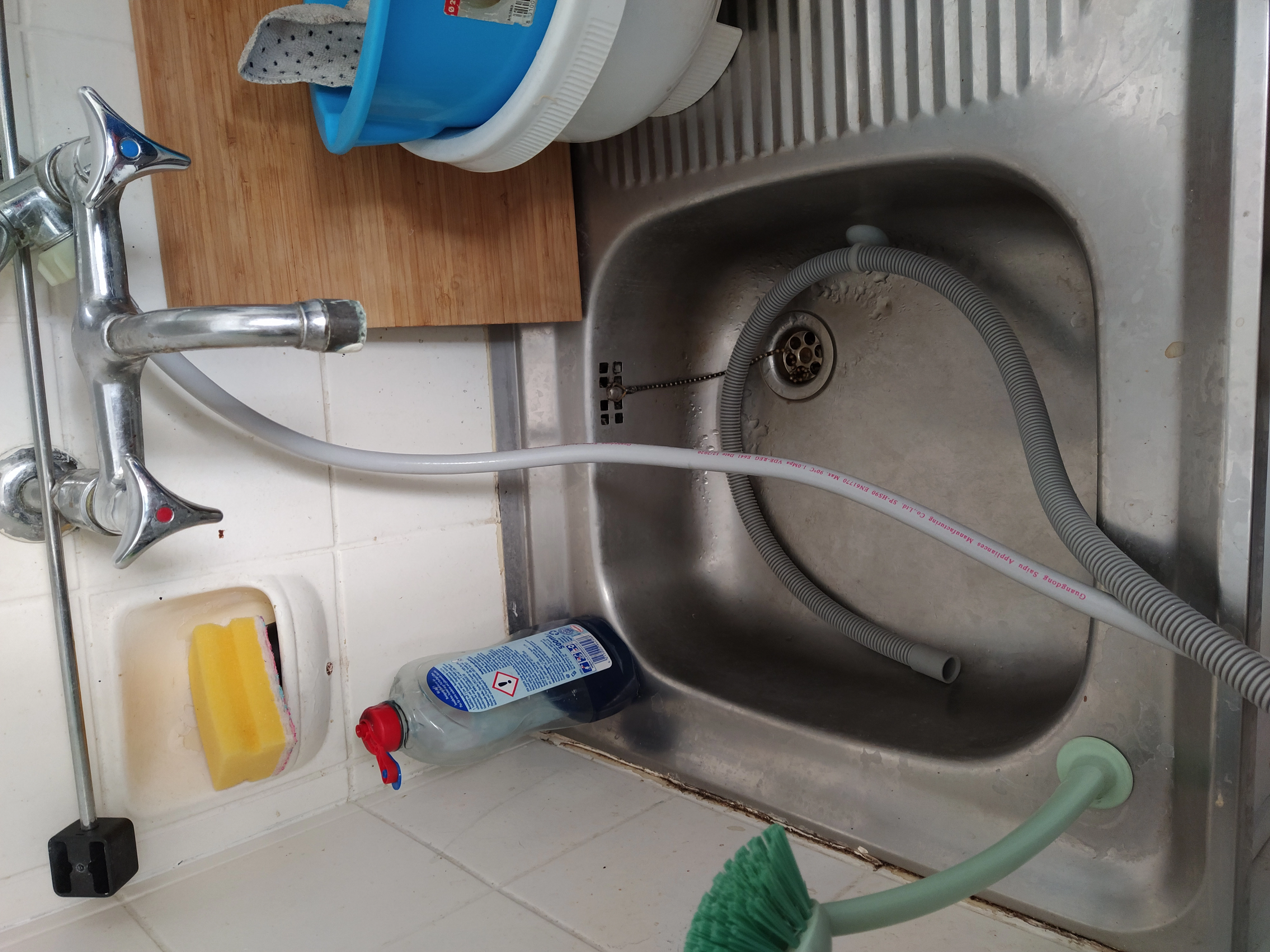 Der Kaltwasserschlauch ist bei mir direkt in der Spüle angebracht, auch wenn ich mir einen etwas längeren Schlauch besorgen musste. In der selben Spüle liegt auch der schön lange Abwasserschlauch, der per Saugnapf auch noch einmal extra gesichert werden kann. So muss ich mich nach Einschalten eigentlich um nichts anderes kümmern.