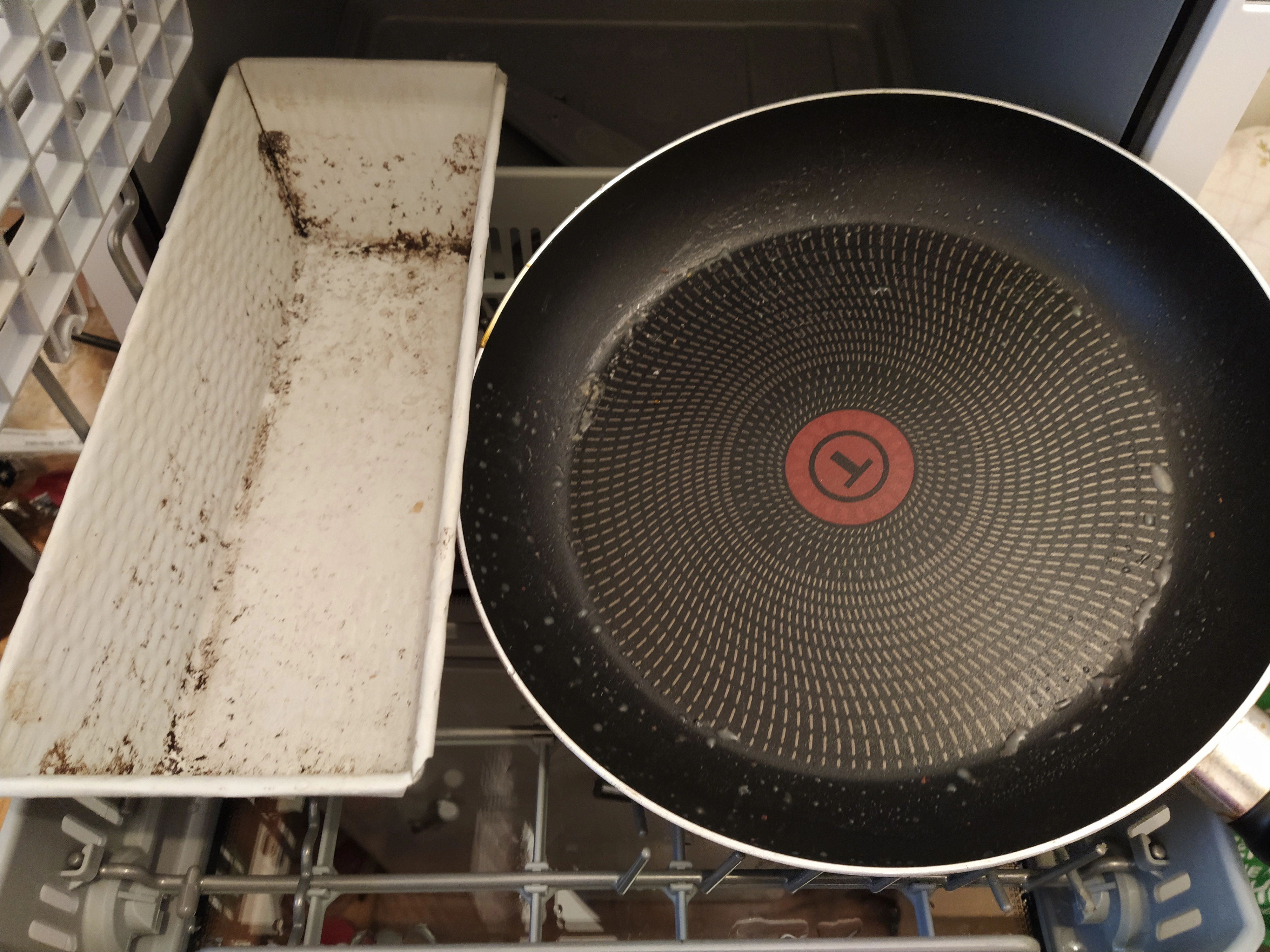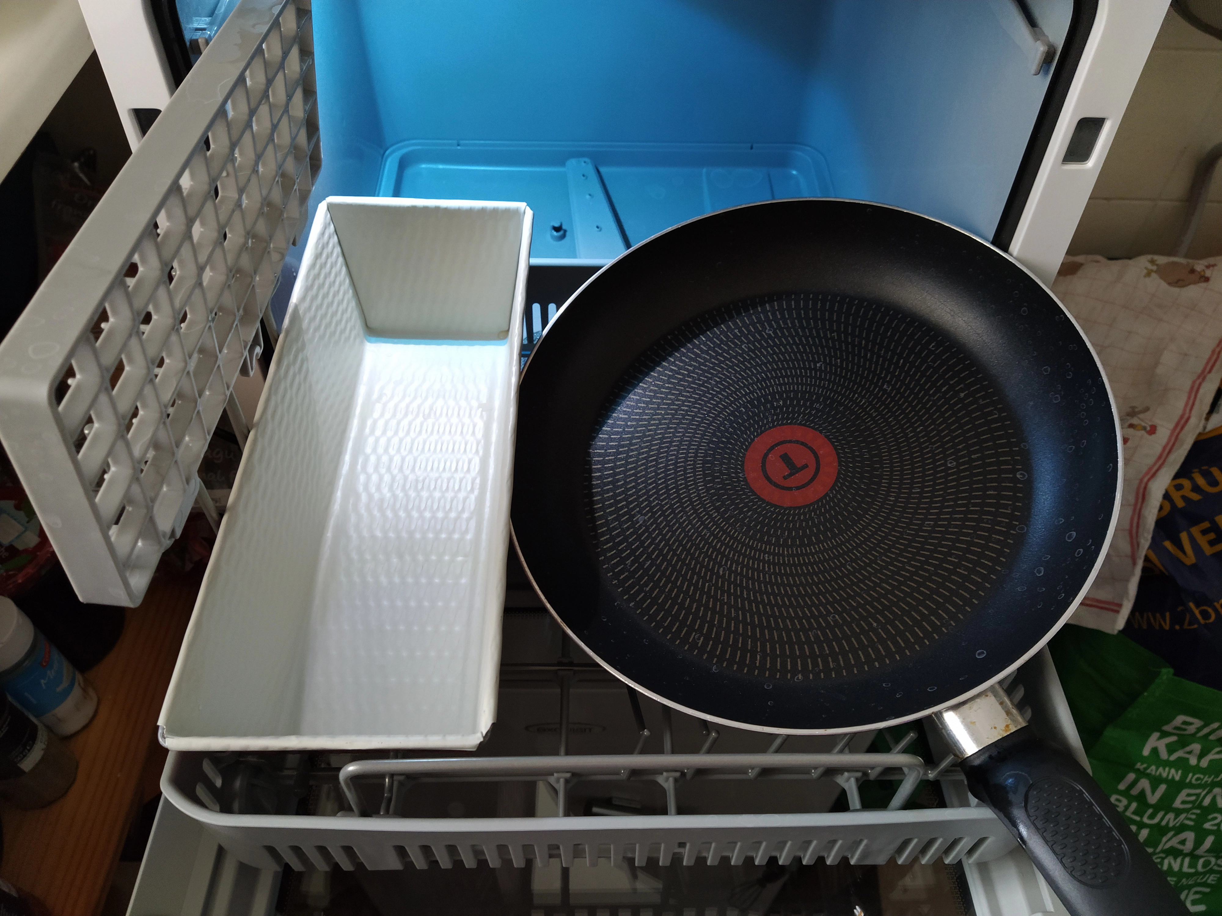 Für mich als Einzelperson also definitiv ausreichend. Einzig größere Gegenstände als Teller sind problematisch. Meine Teller sind schon sehr grenzwertig von der Größe und passen nur schräg in die Kammer. Zu gerade und sie blockieren den oberen Sprüharm. Das heißt leider auch, dass meine Pfanne oder größere Kochtöpfe nicht mit anderen großen Dingen in die Spülmaschine passen. Für mich persönlich ist das aber kein Problem, da ich erstens nicht so viel koche, dass ich das unbedingt bräuchte und zweitens ich einfach nur froh bin den ganzen anderen Kram, der reinpasst, nicht abwaschen zu müssen. Von einer Pfanne oder einem Kochtopf zwischendurch zum händischen Abspülen sterbe ich nicht. Außerdem sollte man beschichtete Pfannen ja eh nicht in die Spülmaschine tun. Ich habs natürlich trotzdem getan, einfach um zu zeigen wieviel Platz es braucht und wie gut die Maschine spült.
