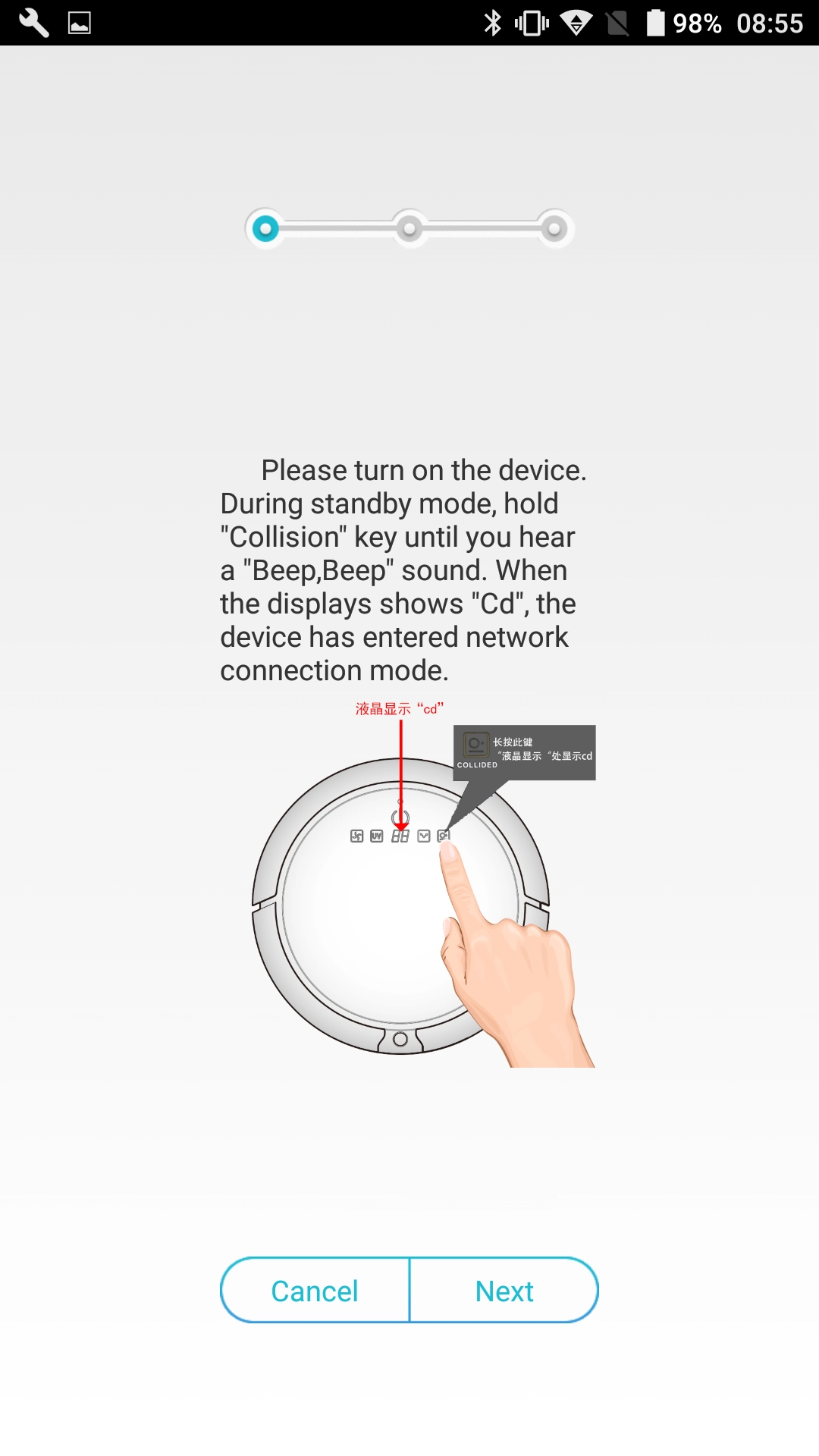- Am Saugroboter erst die „VAC-Taste“, daraufhin „Soft-Touch“ gedrückt halten bis „Cd“ aufleuchtet