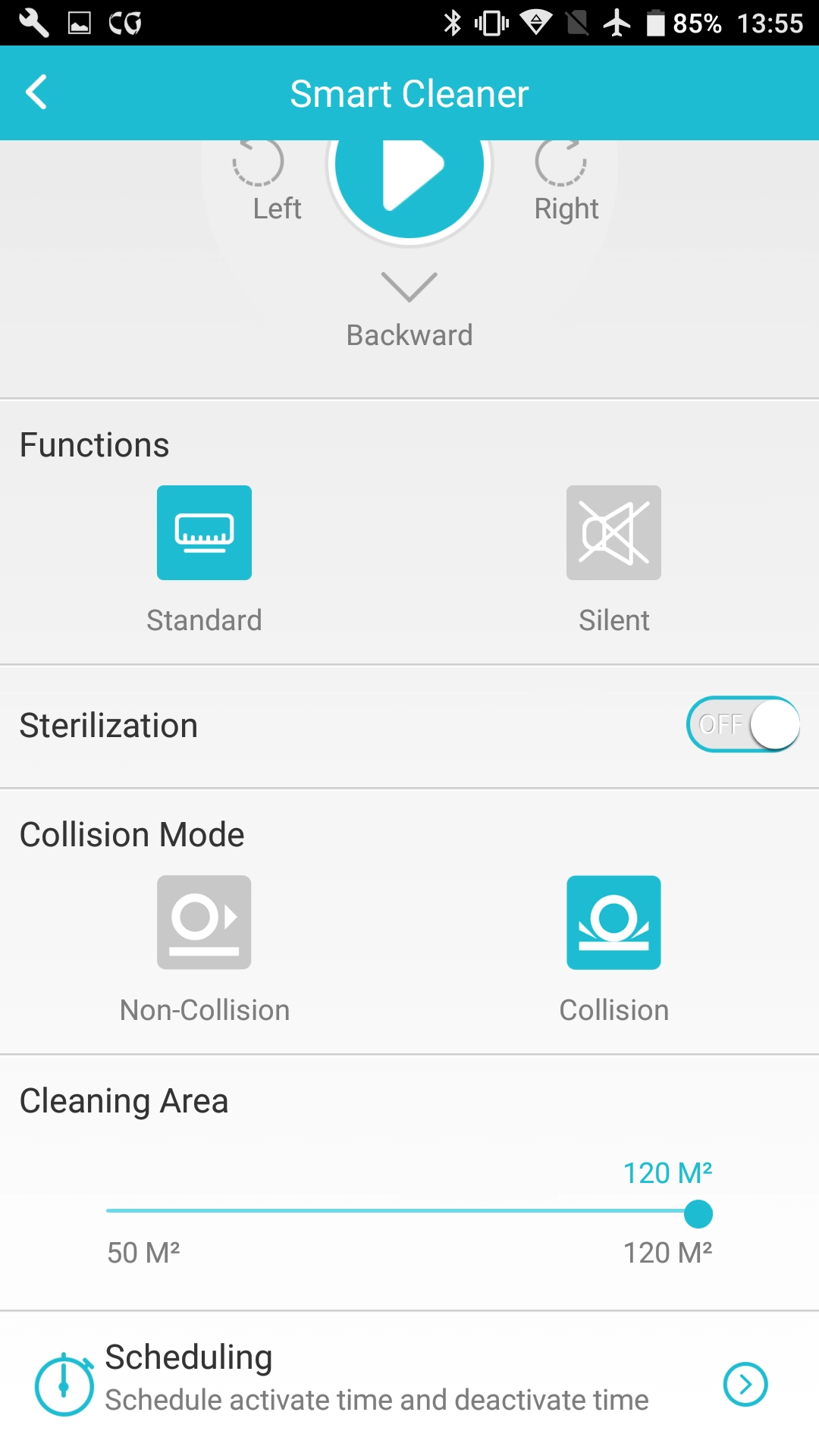Zudem lässt sich über die App auch bei Auswahl von „Non-collision“ vermeiden, dass der Saugroboter gegen Hindernisse fährt. Über seine Sensoren vorne oberhalb der Bürstenköpfe erkennt er diese frühzeitig und weicht aus. Ist allerdings „Collision“ angewählt, lässt sich der ein oder andere Crash vorhersagen. Das einzige Manko an den Einstellungsmöglichkeiten ist, dass diese sich nicht miteinander kombinieren lassen. So lässt sich die Auto-Funktion etwa nicht mit der „Wall-Funktion“ verbinden. Wann der Reinigungsprozess beginnen soll und ob man den Sauger einmal wöchentlich fahren lassen will, lässt sich wie auch die Größe des zu saugenden Raums (50 m² – 120 m²) einstellen.