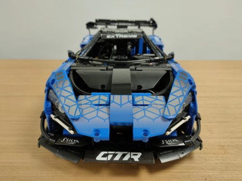Gut gefallen mir die Rücklichter, die deutlich an die schmalen, streifenförmigen Lichter des McLaren angelehnt sind, und eigentlich das gesamte Heck des Fahrzeugs. Das hat auch beim Aufbau besonders viel Spaß gemacht. Kleines Extra: Obwohl die typischen blauen Pins verwendet werden, fallen die hier gar nicht so negativ auf, da sie natürlich zum Rest des Fahrzeugs passen.