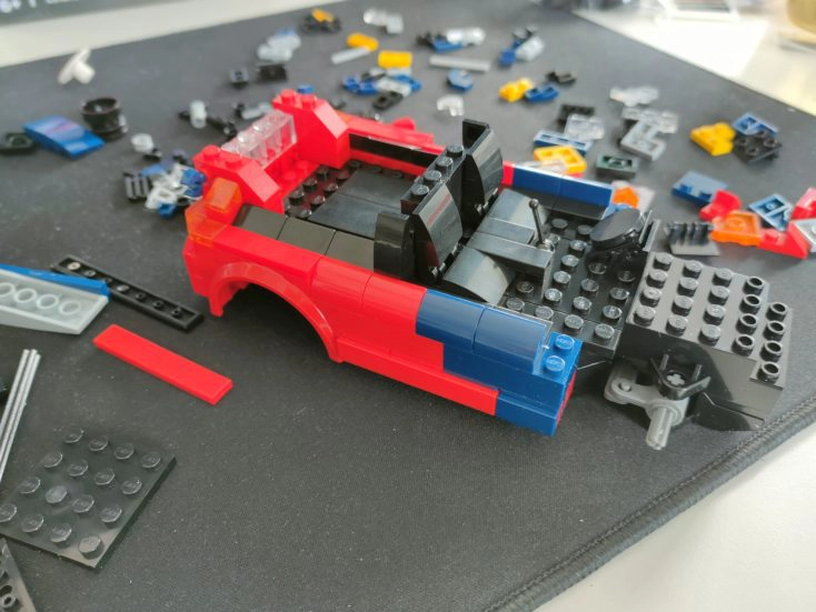 Trotz der Einfachheit hat der Aufbau aber etwas sehr befriedigendes. Man baut die Karosserie in mehreren Teilen um das Fahrwerk herum; wenn sich die fertigen Kotflügel dann perfekt in die vorher freigelassene Aussparung an der Seite einfügen, dann zaubert das schon mal ein zufriedenes Lächeln ins Gesicht. Insgesamt bin ich hier also sehr zufrieden und hatte viel Spaß beim Aufbau. (Und ich habe mittlerweile so viele Sets aufgebaut, dass ich das nicht mehr bei jeden Modell sagen kann.)