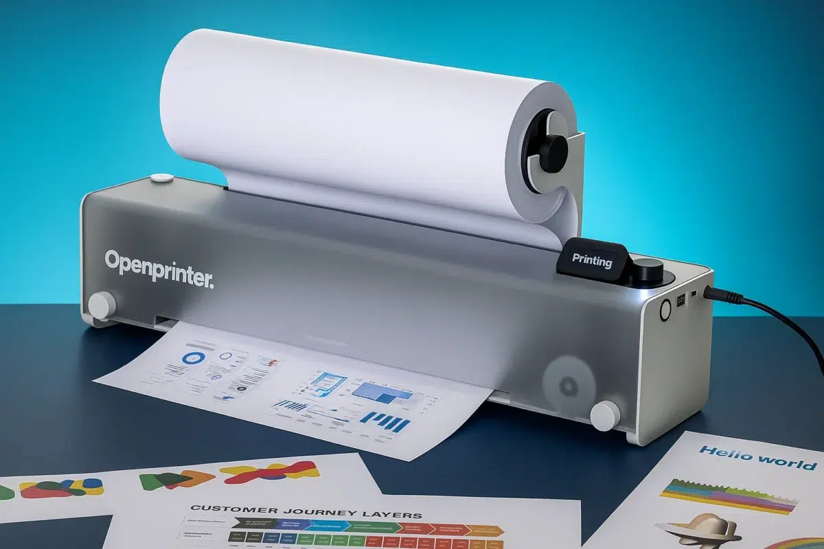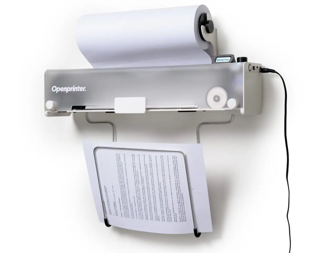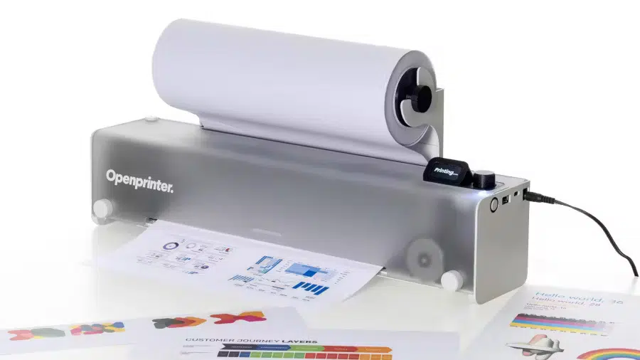 Das Highlight ist aber die Papierführung. Statt nur einzelne Blätter (A4, A3) zu schlucken, kann der Open Printer auch mit Papierrollen gefüttert werden. Ein integrierter Cutter schneidet das Papier dann entweder auf Standardformate zu oder ermöglicht den Druck von langen Bannern und Streifen – eine kreative Freiheit für Künstler und Bastler.